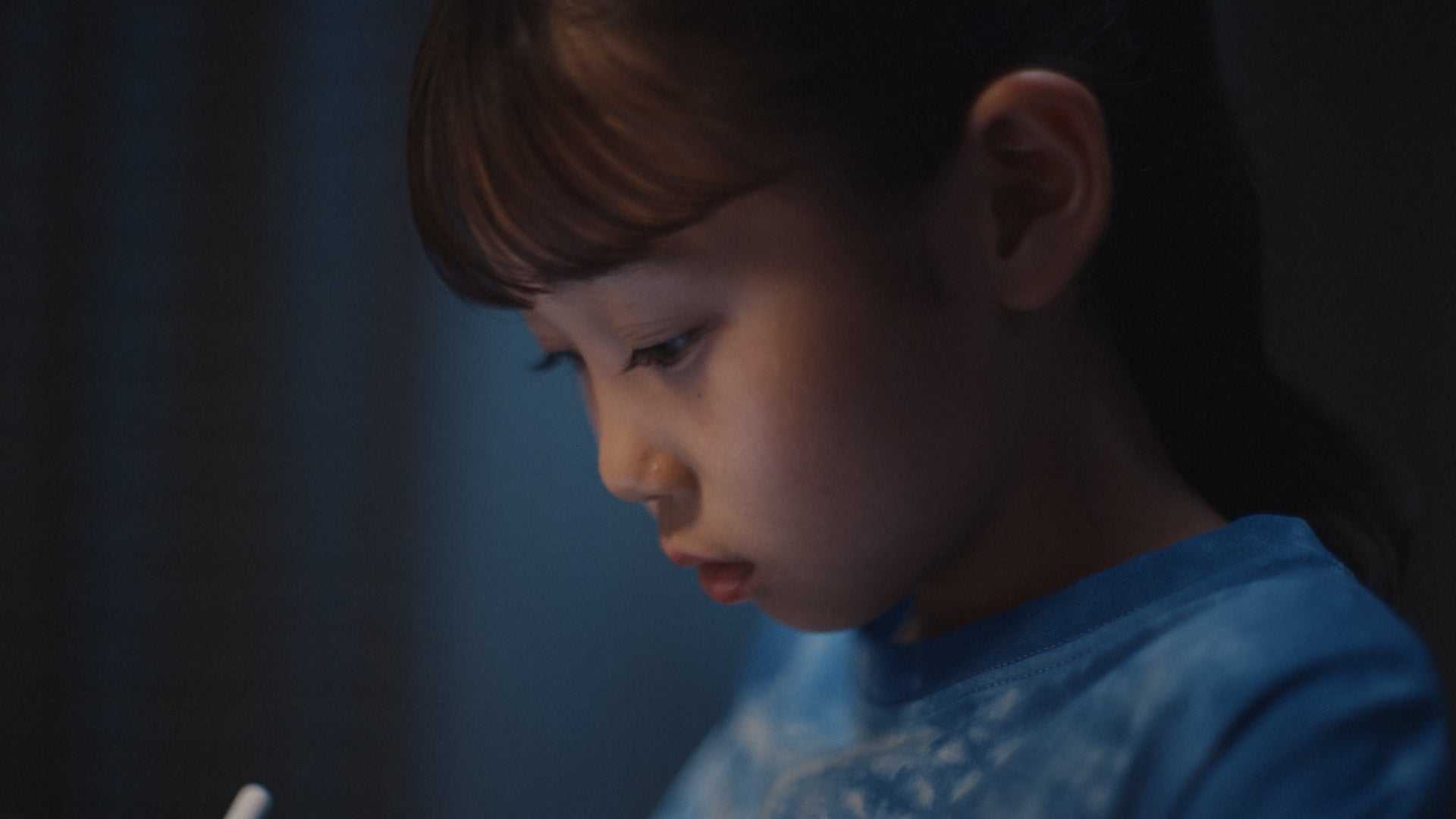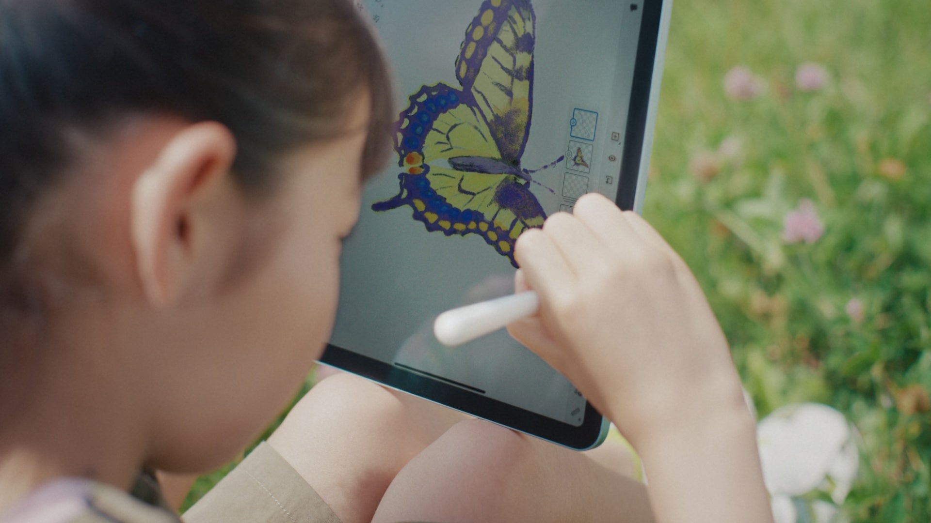 本CMは、夏休みに大好きな蝶を毎日描き続ける少女の日々を描くことで、デジタルアートの楽しさを伝えています。野原や昆虫館で真剣に蝶を観察しながらiPadで絵を描く少女は、家に帰った後も捕まえたモンシロチョウの絵を描き、夜になっても鮮やかな蝶の羽を描きます。少女がiPadを操作すると、これまで描いてきた数々の蝶が重なり合い、少女の周りをドレスのように飾り、デジタルアートならではの自由な表現が見られます。