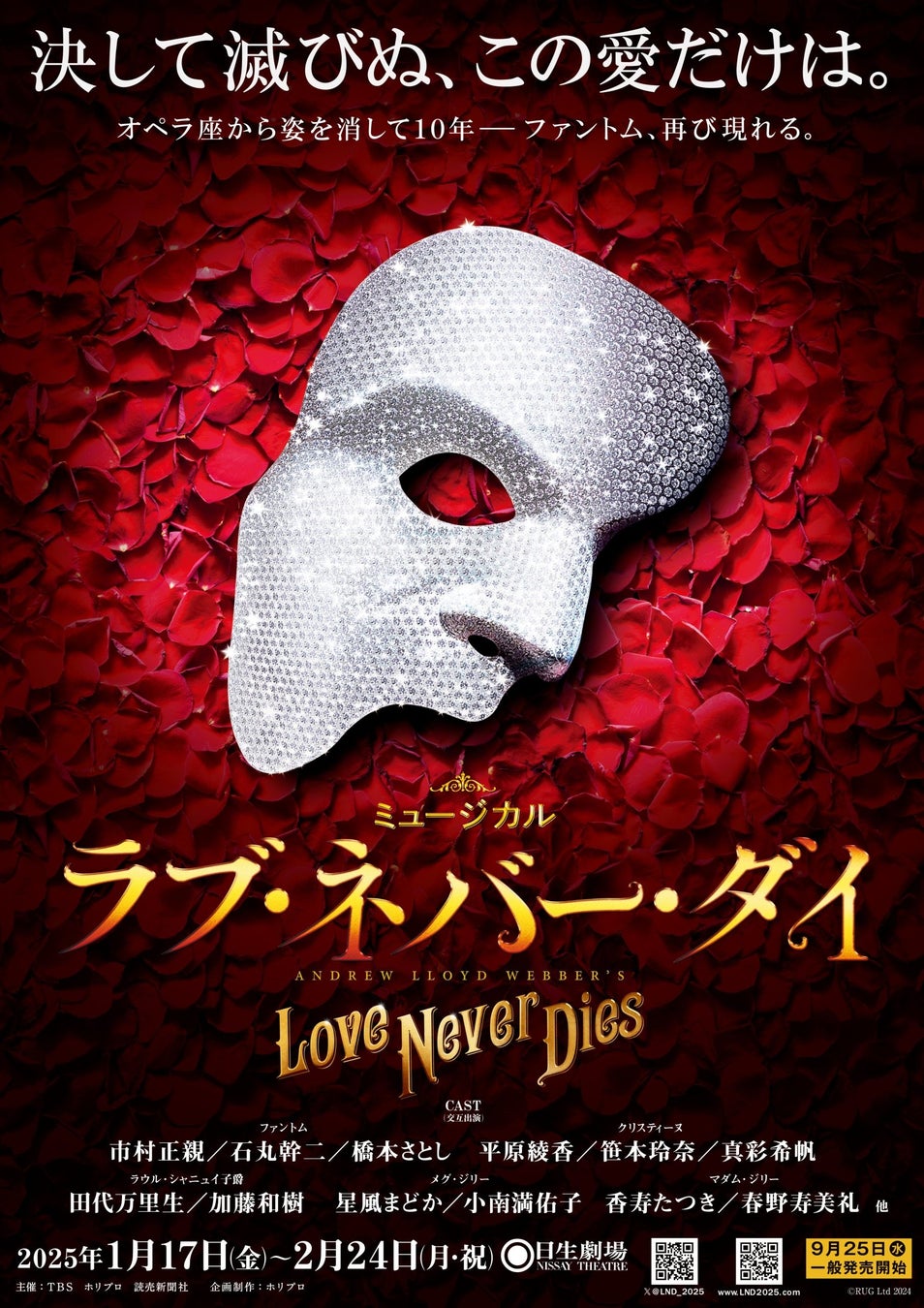 2014年、19年と、歴史ある日生劇場の舞台にふさわしい豪華キャストで上演を重ね、常に完売を記録してきたミュージカル『ラブ・ネバー・ダイ』が25年1・2月に待望の再々演決定!キャスト出演スケジュールが発表となった。