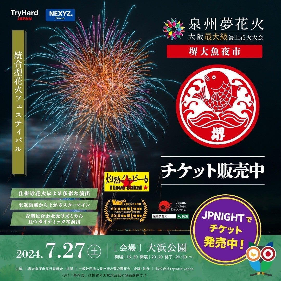 「泉州の観光資源創出による地方創生」をテーマに、地域密着型の統合型花火大会「泉州夢花火」と、大阪府堺市の大浜公園で毎年7月末に行われる「堺大魚夜市(さかいおおうおよいち)」が共催し、大魚夜市のフィナーレを飾る打上花火を「泉州夢花火in堺大魚夜市」とブラッシュアップして開催いたします。