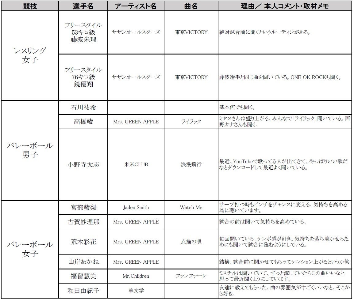 パリオリンピックでは現地から随時、最新情報をお伝えするTOKYO FMアナウンサー後藤亮介をはじめTOKYOFMスポーツ取材チームが、注目の日本代表選手たちに、「試合前に聴く曲」や「心の支えとしている」曲を独自取材!