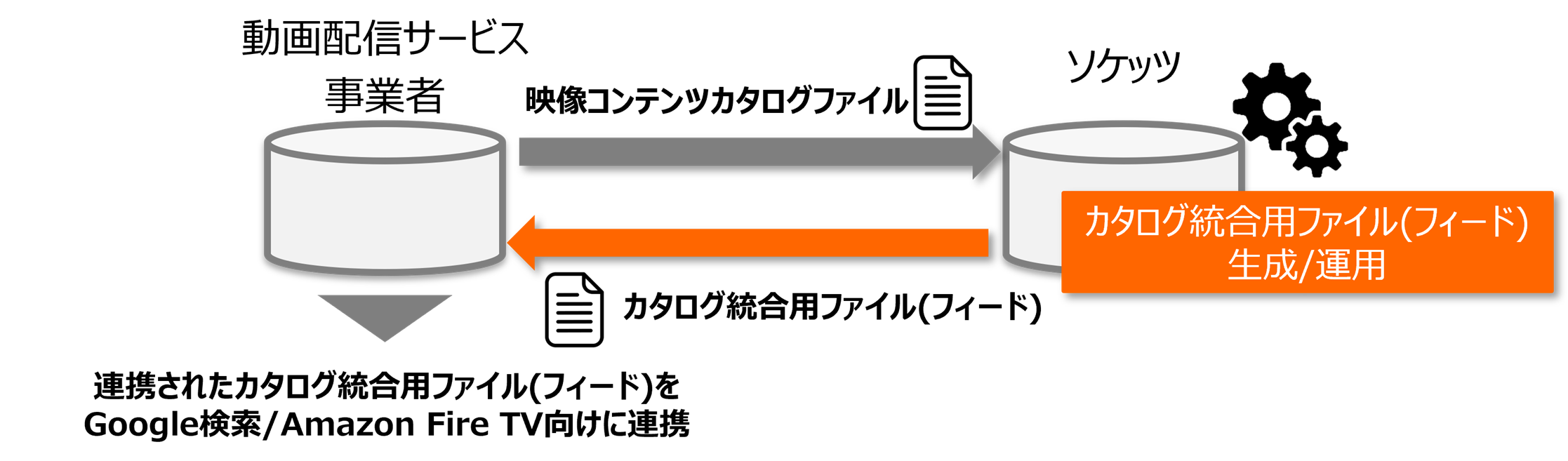 本サービスは、動画配信サービスの映像コンテンツのカタログに基づき、Google検索 Watch ActionおよびAmazon Fire TV ユニバーサル検索用カタログ統合の仕様にあわせて最適化したファイルを生成/運用するサービスです。