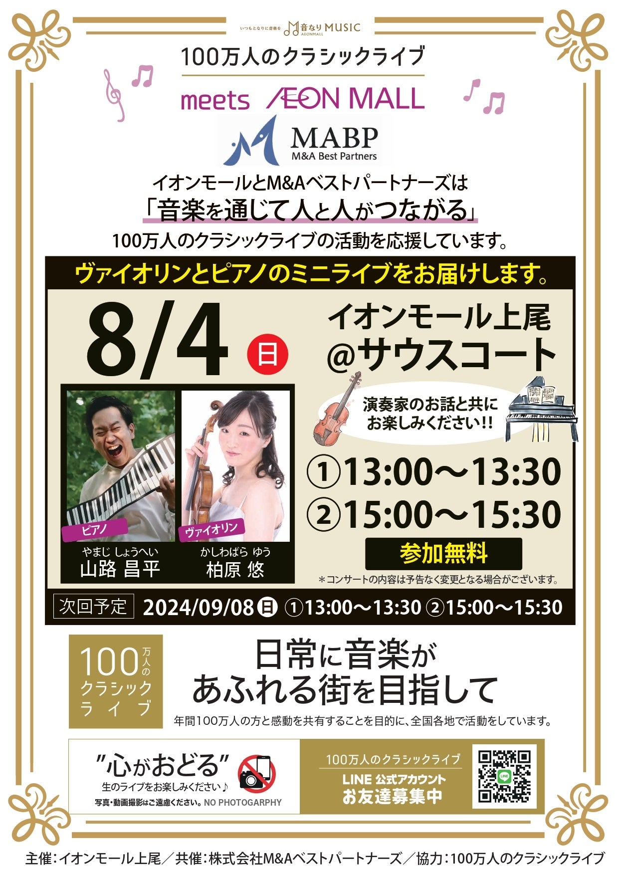 100万人のクラシックライブは、あらゆる人の日常に音楽の感動を届けることで、孤立を防ぎ穏やかで心豊かな社会生活を取り戻すきっかけとし、支え合いの輪を広げることを目指し、多くの方が行き交う『イオンモール上尾』にてライブを開催いたします。