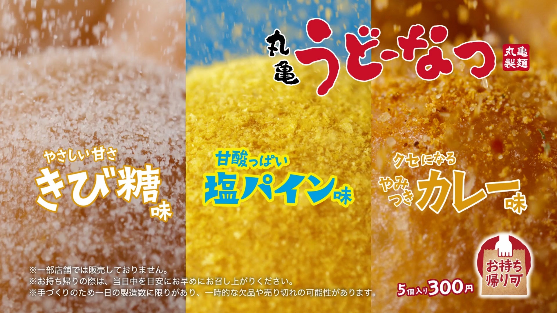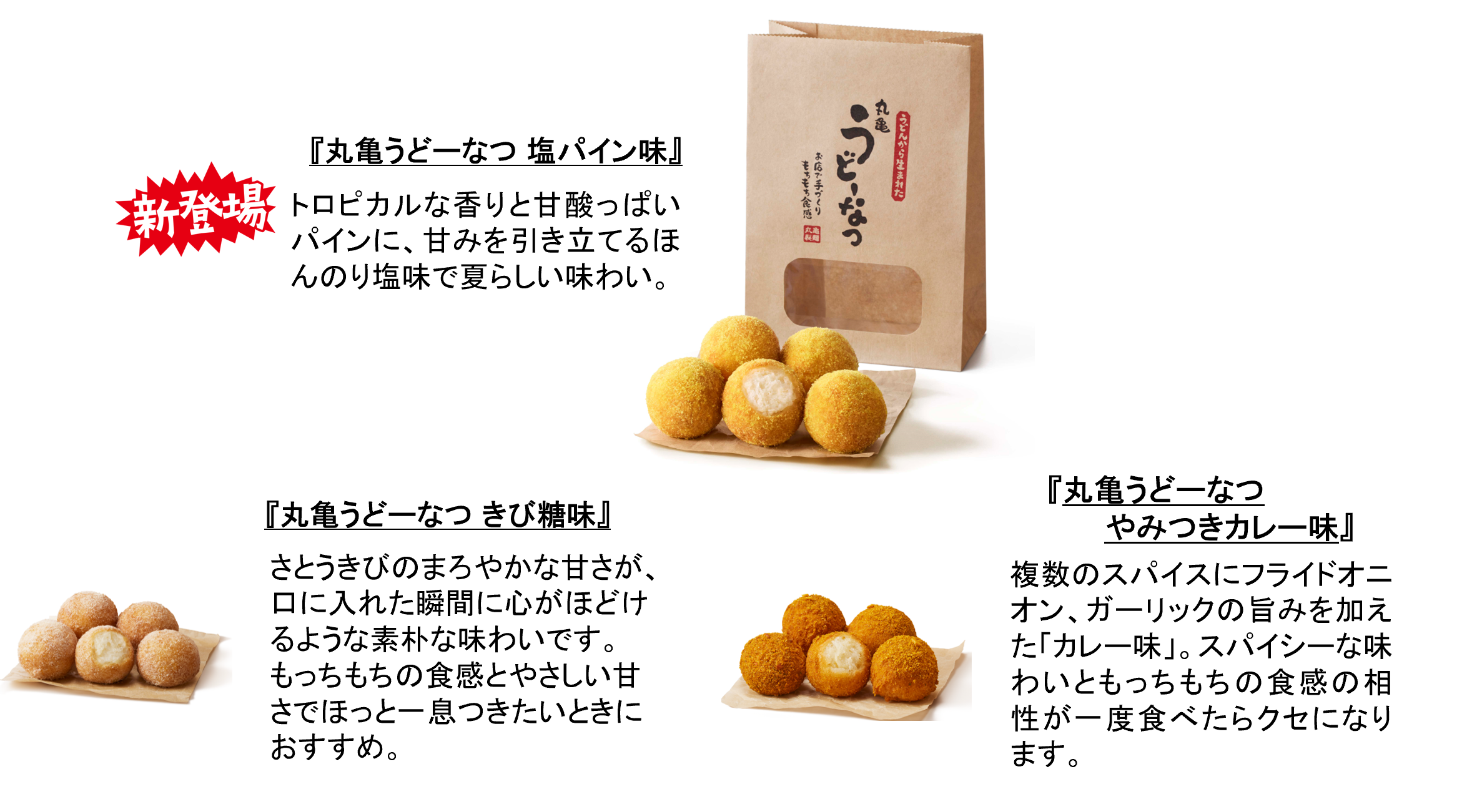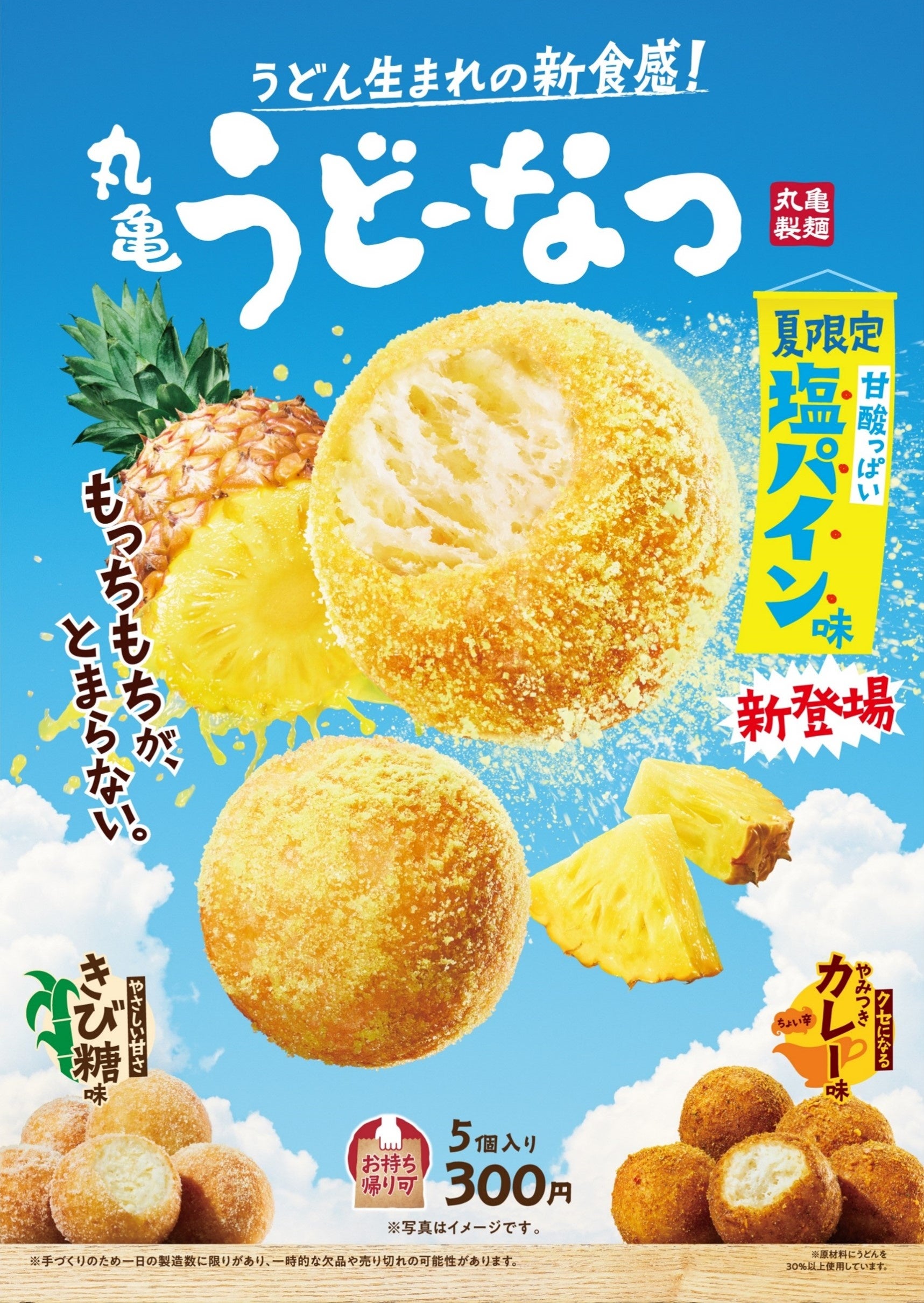 この夏は、新登場の『塩パイン味』と、大好評販売中のやさしい甘さの『丸亀うどーなつ きび糖味』、スパイシーさがクセになる『丸亀うどーなつ やみつきカレー味』の3種類をお楽しみいただけます。もっちもちの食感とパインの弾けるような甘酸っぱさ、ほのかな塩味に思わず手が止まらなくなるおいしさを是非お楽しみください。