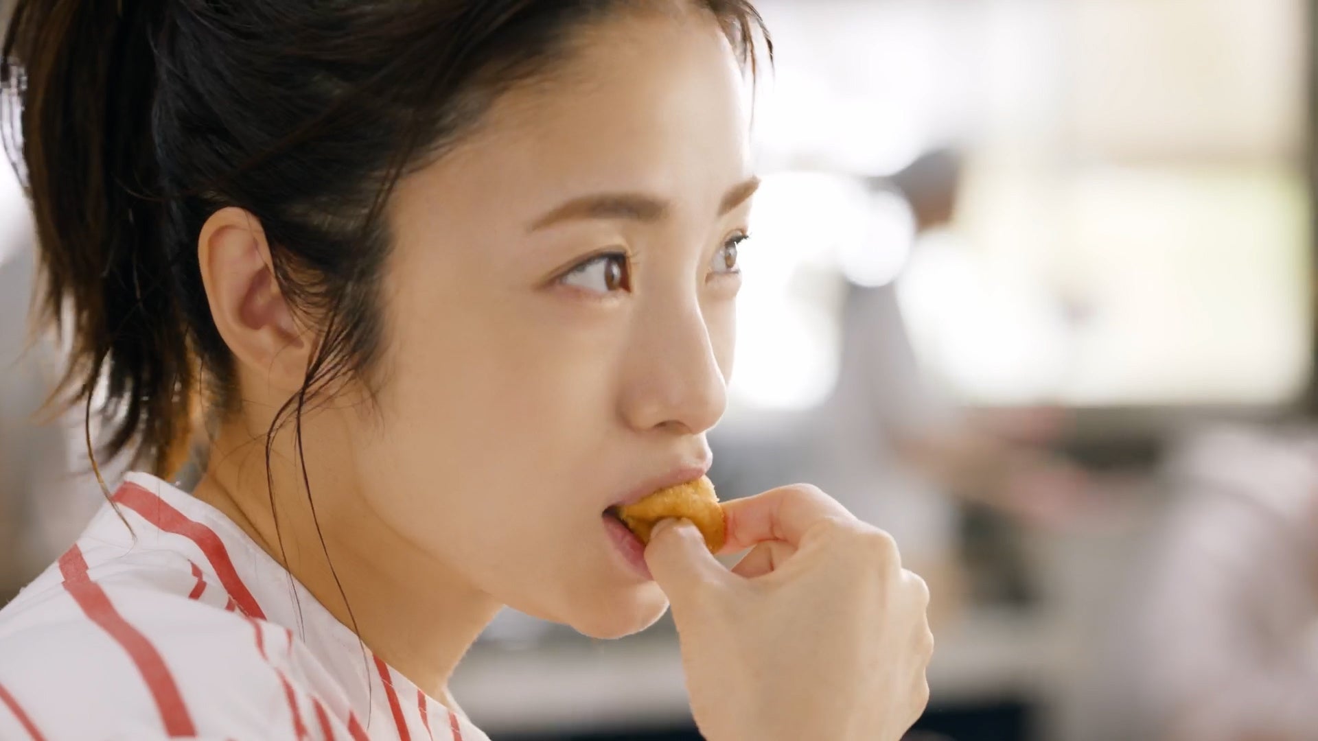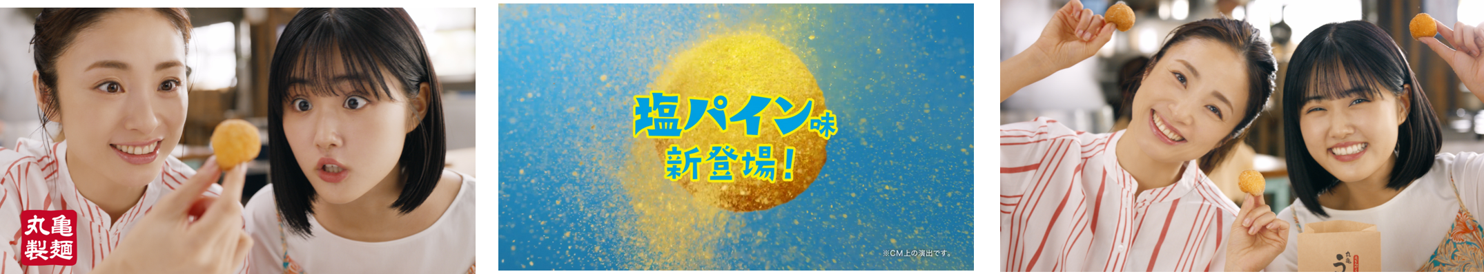 今回のTVCMは、丸亀製麺の店舗を再現したスタジオで、上戸さんと原さんが「丸亀製麺のうどーなつ!?」と声を揃え「丸亀うどーなつ」をじっくり見つめるシーンから始まります。その後「夏限定、『塩パイン味』新登場!」という上戸さんのナレーションとともに、今回新たに登場する「塩パイン味」をイメージしたパイナップルの映像が映し出されます。上戸さんと原さんは「丸亀うどーなつ」をひと口頬張り、そのもっちもちな食感と口いっぱいに広がる甘酸っぱい味わいに「夏も、もっちもちが、止まりません!」と思わず至福の表情を浮かべます。そして、上戸さんの「丸亀うどーなつは3つの味だよ!」というナレーションとともに、夏限定の『塩パイン味』と、好評販売中のやさしい甘さの『きび糖味』、クセになる『やみつきカレー味』の3種が映し出されます。最後に「丸亀うどーなつ」を両手に楽しげな雰囲気の上戸さんと原さんの様子で本TVCMは締めくくります。