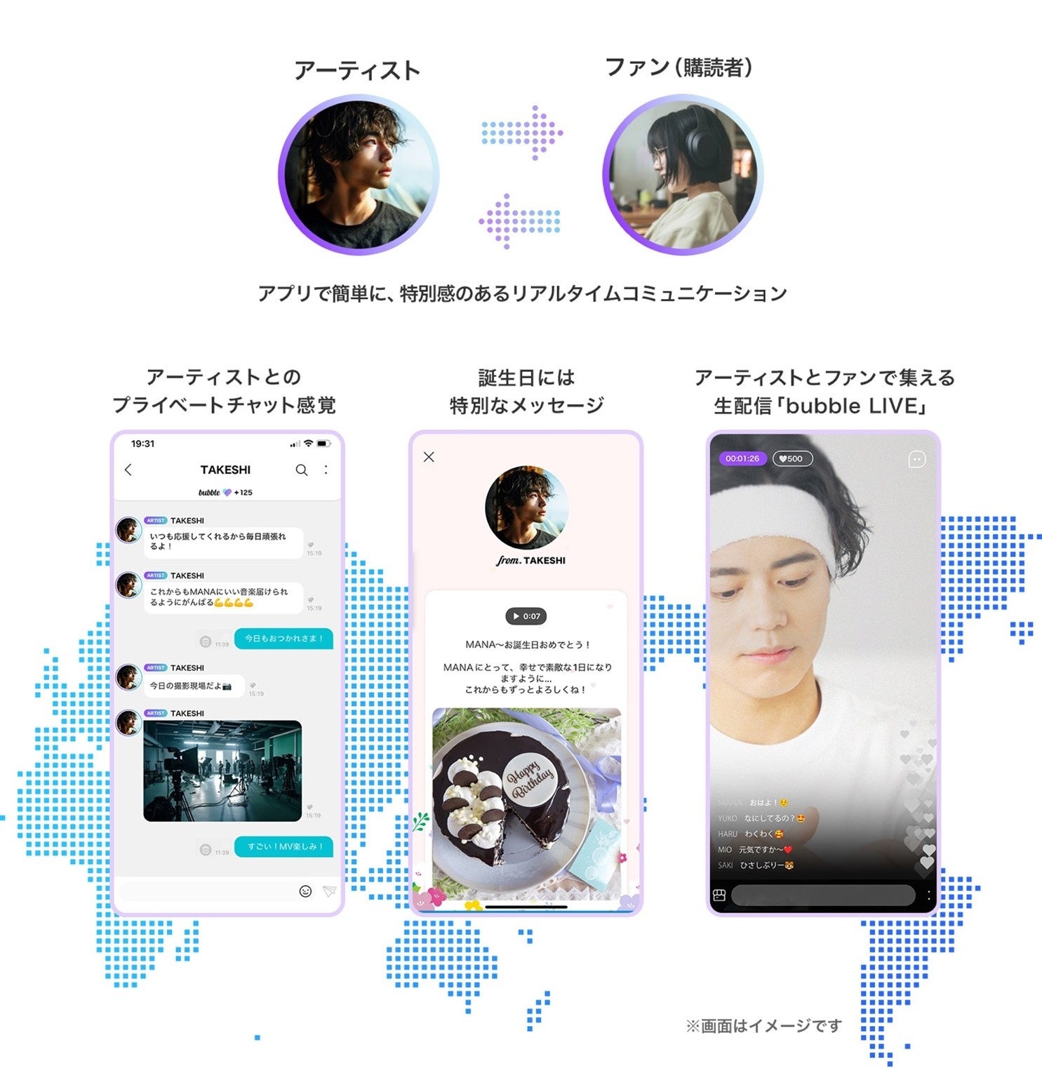 bubbleは“ファンがアーティストとプライベートメッセージ感覚を楽しめる”コミュニケーションアプリです。
