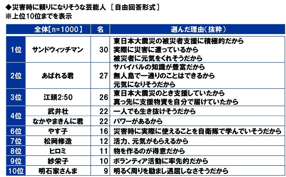 選んだ理由をみると、1位の「サンドウィッチマン」では「東日本大震災の被災者支援に積極的だから」「実際に災害に遭っているから」「被災者に元気をくれそうだから」、2位の「あばれる君」では「サバイバルの知識が豊富だから」「無人島で一通りのことはできるから」「元気になりそうだから」、3位の「江頭2:50」では「東日本大震災のとき支援していたから」「真っ先に支援物資を自分で届けていたから」といった回答がみられました。