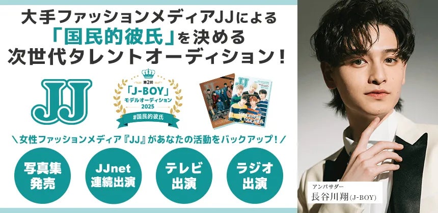 「第2回 JJモデルオーディション2025」を開催致します。2025年に迎える創刊50周年に向けて「J-GIRL」=「国民的彼女」、「J-BOY」=「国民的彼氏」という時代を牽引するスターを募集し育成するプロジェクトです。面接・カメラテスト、ライブ配信、WEB投票などから総合的に判断してグランプリ2名とJJ編集部賞2名を決定致します。グランプリ・JJ編集部賞に輝くと写真集発売、JJイベント出演、JJnet連続出演、テレビ出演、ラジオ出演、など、JJ全面協力のもとJ-BOYを1年間盛り上げます。創刊50周年を迎える節目の年にJJモデルとなる、今よりも輝きたい皆様のご応募をお待ちしております。