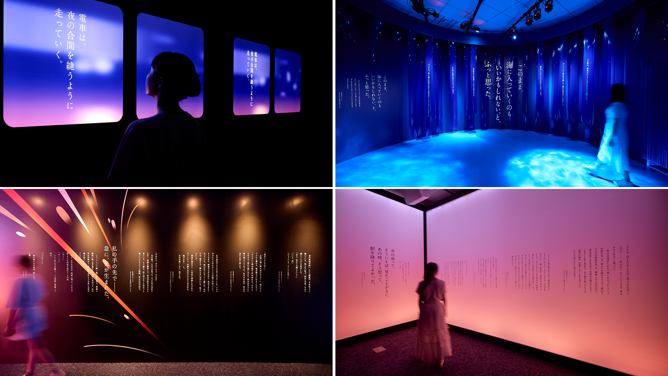 本展示では、少し怖くて切ない辻村美月の小説「ユーレイ」世界から、花火が彩る海のシーンが印象的な「海のまにまに」の世界をイマーシブに体験できます。