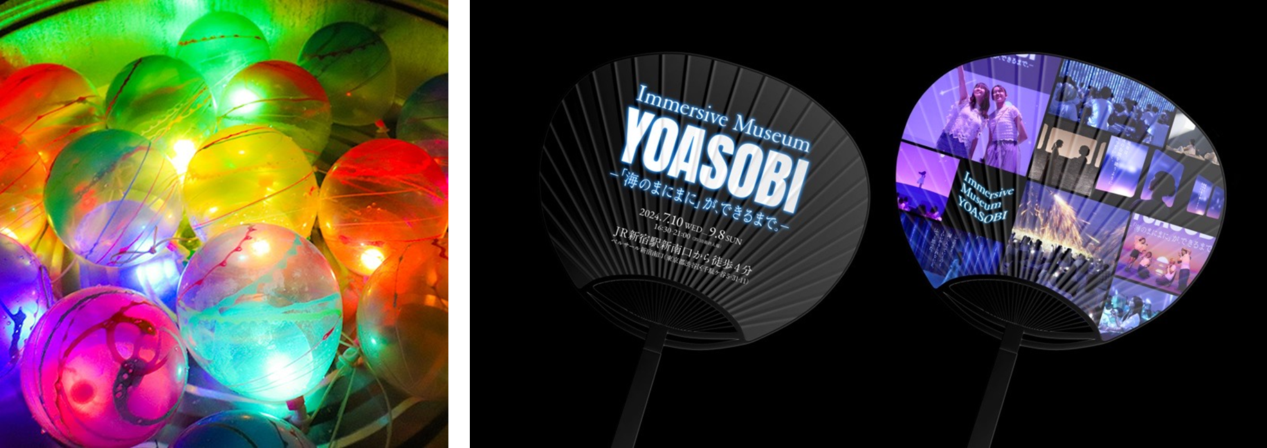夏祭りの代名詞的存在であるヨーヨーと、「Immersive Museum YOASOBI ―「海のまにまに」が、できるまで。―」のためにオリジナルにデザインされたうちわとともに夏祭気分を味わいながら展示をお楽しみいただけます。