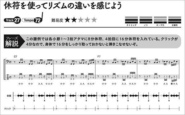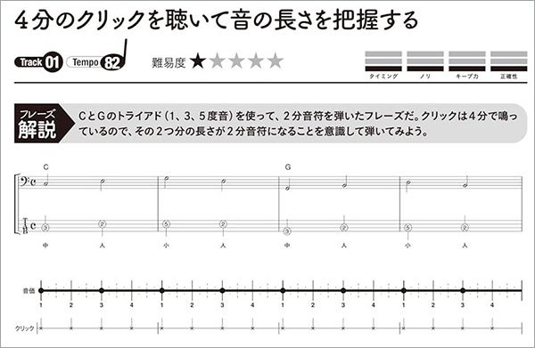 単にクリックを4つ鳴らすだけではなく、ウラで鳴らす、数を減らすなど、さまざまなトレーニング・フレーズを掲載。正確なリズム感が身につくリズム強化に特化した教則本です。