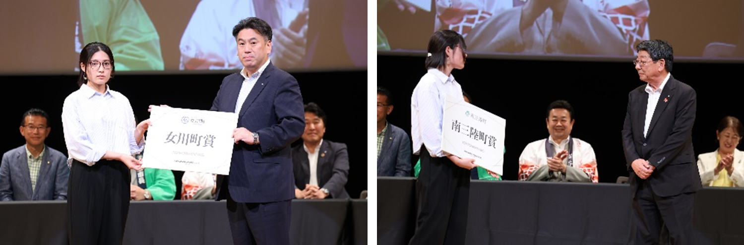 女川町受賞者:和田真聡さん(代理登壇)「映像制作はどのような編集をしたら女川の魅力が伝わるか考えて作りました。“しあわせの黄色いポスト”がとても可愛いので女川へ来たときにはぜひ探してみてください。」須田善明女川町長「多くの投稿作品は比較的グルメ系が多かったのですが、和田さんの作品は女川の良さをバランスよく伝えてくれたと思います。作品中いろいろな風景を取り上げていただきましたが、震災ですべてなくなってしまった場所が復興して、今はうれしい、楽しい場所になっているのでぜひ多くの皆さんにお越しいただきたい。」