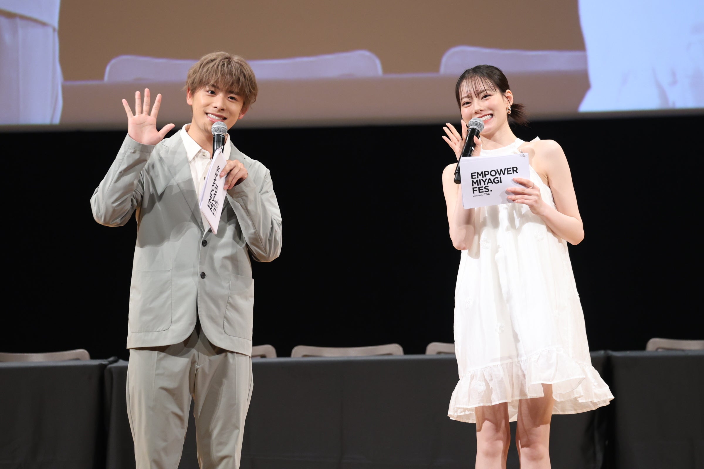TGC 2024 S/Sのステージ上で、サプライズ公開プロポーズ&婚約発表し話題となったなこなこカップルがMCとして登場すると会場から歓声が!「宮城に親戚が住んでいて小学生ぶりぐらいに来ました!」「宮城は美味しいものがいっぱい。この後グルメブースでも色々食べてみたい!」と語り、スタートしました。