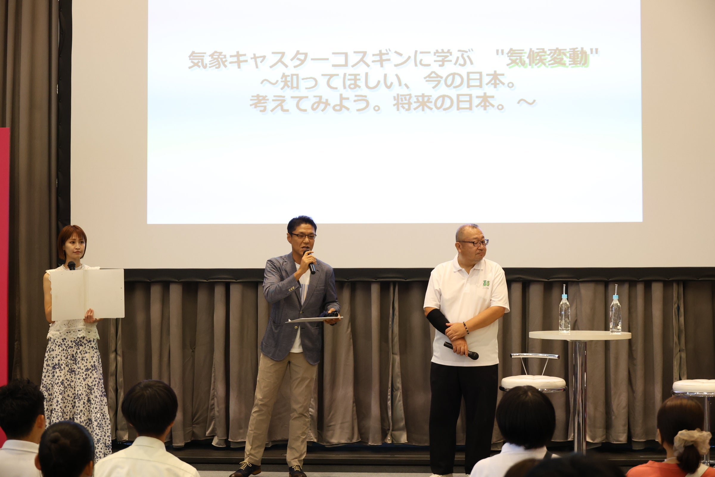 ここでスペシャルゲストとして、暑い夏を吹き飛ばすかのような爽やかな白いワンピースで藤井サチが登場すると、会場には大きな拍手が。モデル、そして食育インストラクターとしても活躍をする藤井サチが感じる気候変動について「雑誌の撮影は秋冬の服を夏に着るんですね。元々代謝が悪いので汗をかきづらかったのですが、今年からコートの下に汗をかくようになって。日本は四季があってファッションをすごく楽しむことができるはずなんですけど、最近薄手のトレンチコートを着る機会や、暑くて夏にシアーシャツを着るタイミングがなかったり、すごく残念です。」とモデルならではの視点で感じる気候変動についてトーク。また、最近の天候について「雷雨がすごくないですか!?SNSでも“この世の終わり”とトレンド入りするくらい。」と藤井サチが小杉に問いかけると、「昔でいうと夕立というものだったのですが、そんな風情あるものではなく、恐ろしいものになっていますよね。これも気候変動です。雷雨が多くなっている原因として、暑いと海の温度も上がってしまい、海の温度が上がると水蒸気がたくさん出ます。それが雷雲を育ててしまうことも一因なんですね。」と解説。