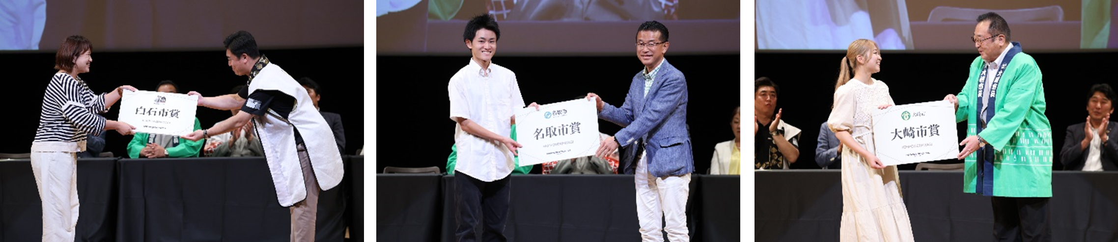 名取市受賞者:佐藤璃一さん「この動画は3人で作りました。副賞でいただいた宿泊券でみんなで泊まりたい。」山田司郎名取市長「サイクルスポーツセンターの動画を作っていただきありがとうございます。面白い自転車がいっぱいあります。名取市は温泉やフォトスポットがいっぱいあるのでぜひ遊びに来てください。」
