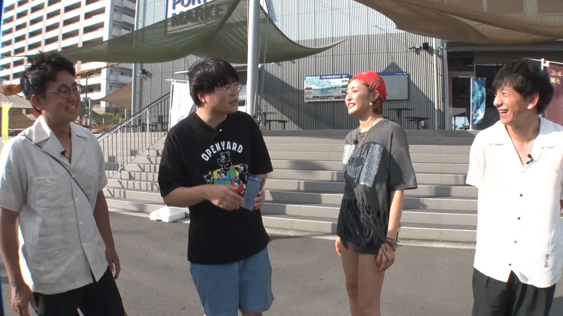 ドライブ前半戦が終了し、「いちごよこすかポートマーケット」に到着!目移りするほど美味しそうなグルメがいっぱいで、何を食べるか悩む4人。選んだグルメを堪能し、次の目的地へ。