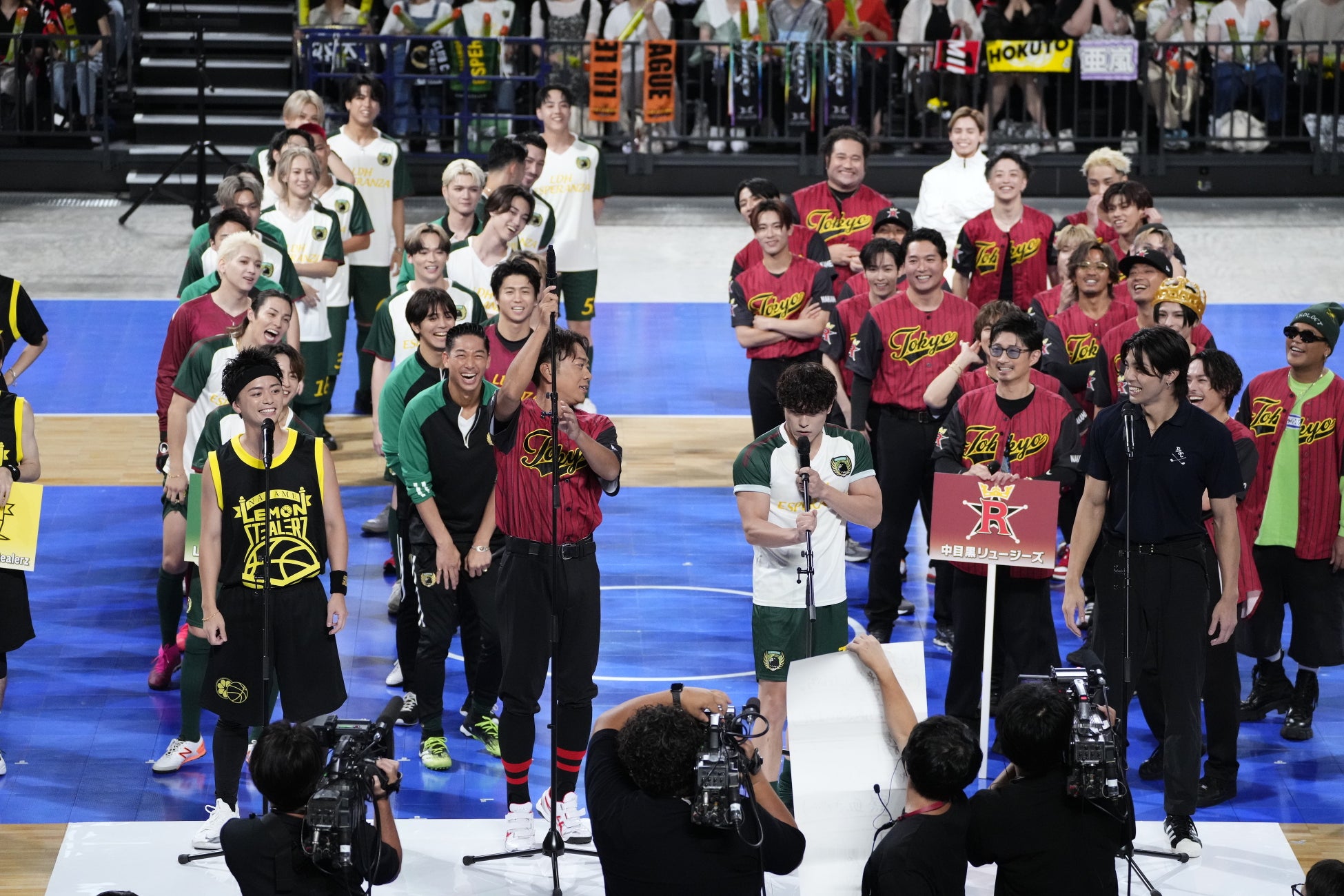 昨年は中目黒リュージーズとLDH ESPERANZAによる対決だったが、今回はNAKAME Lemon StealerzとLDH FULL SWING CLUBも加わり4つのクラブチームで対決。NAKAME Lemon StealerzとLDH FULL SWING CLUBはまだクラブチームとして日が浅く、部員も少ないため助っ人や新入部員も数多く参加した。NAKAME Lemon StealerzのキャプテンのSWAYは「バスケ部超スーパー新入部員(仮)なんですけど」と吉野北人を紹介すると客席からは歓声が上がった。吉野も「ボコボコにします!」と気合いをアピールした。一方、LDH FULL SWING CLUBに助っ人として参戦したØMIはゴルフの経験を尋ねられると「2回くらい」と正直に答え、会場の笑いを誘った。