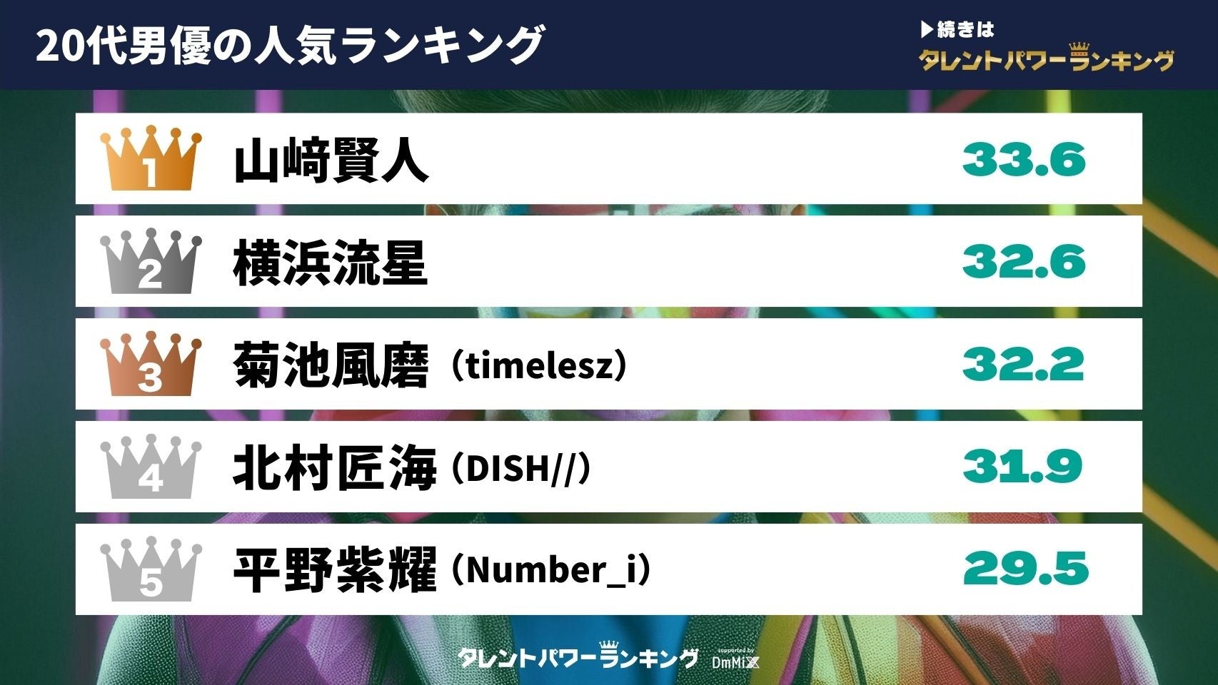 『タレントパワーランキング』では、タレントパワーランキングに登録されている、2024年8月13日時点で年齢が20代・30代の男優のパワースコアを調査。