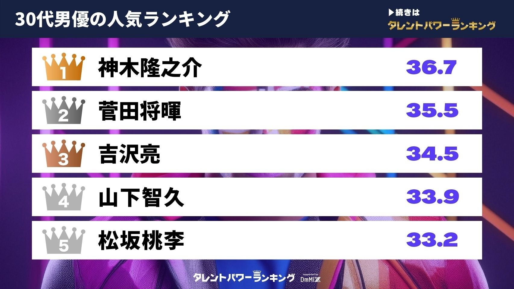 30代では、2023年放送のNHK連続テレビ小説「らんまん」や2023年公開の映画「ゴジラ-1.0」、そして2024年10月スタートのTBS日曜劇場「海に眠るダイヤモンド」で主演を務めるなど、ドラマや映画、舞台など幅広いジャンルで活躍している男優が1位にランクイン。