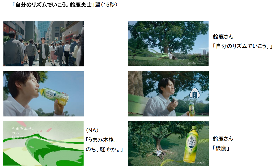 新CMとして前回に引き続き「綾鷹」アンバサダーの宇多田ヒカルさんが出演する「自分のリズムでいこう。宇多田ヒカル」篇を公開します。味わいを表現したグリーンウェーブのアニメーションの後、自分のリズムで歩き出す姿が描かれています。鈴鹿央士さんが出演する「自分のリズムでいこう。鈴鹿央士」篇では、周囲に流されることなく自分らしく楽しむ姿が描かれています。さらにインタビューでは、「綾鷹」を愛飲されている鈴鹿さんに「綾鷹」のCM出演が決まったときの感想や鈴鹿さんにとっての最高の自分タイムなどについて語っていただきました。