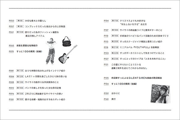 ほかにも、愛犬や愛用ギターも登場する撮り下ろしフォト、すぅが作詞を手がけたSILENT SIREN楽曲の歌詞解説(10曲分)、プライベートなことから音楽についてなどさまざまな事柄を聞いた100の質問、レアな衣装&愛器&私物紹介によって、等身大のすぅの魅力をお届けします!