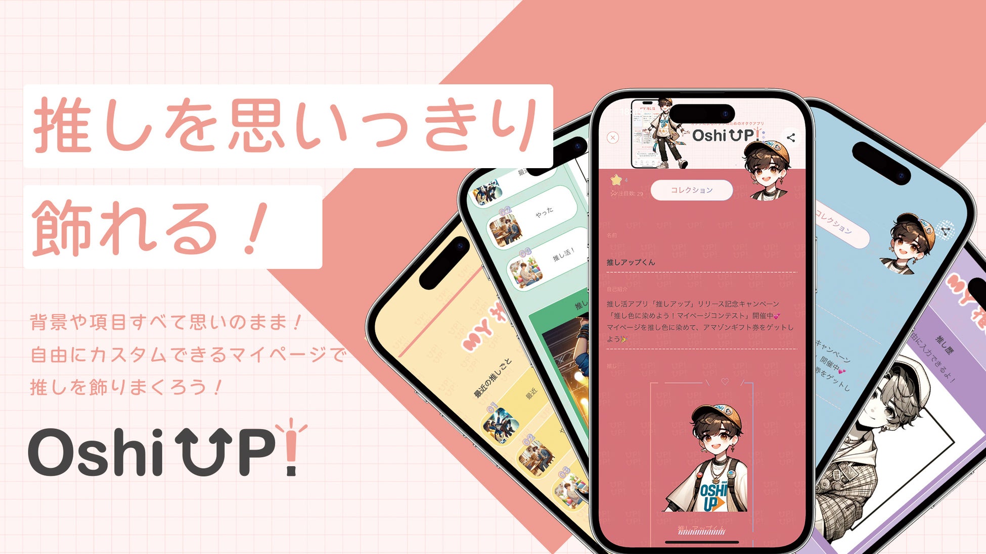 推し活アプリ推しアップのイチオシコンテンツ!背景や文字などを自由に推し色カラー設定したり、推しのポイントやグッズ、推しメイクなど、自分の好きな推しコンテンツを自由自在にカスタマイズできるマイページで推しへの愛を語ろう!