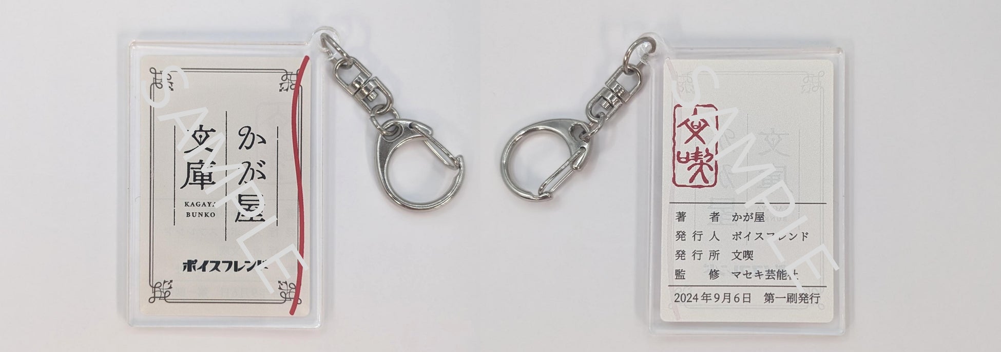 また「ボイスフレンド」の定番グッズ・音声AR機能付きアクリルキーホルダーは、かが屋のアイデアをもとにした文庫本モチーフのデザインとなっています。収録音声は「文喫」での体験とは異なる内容を予定しています。