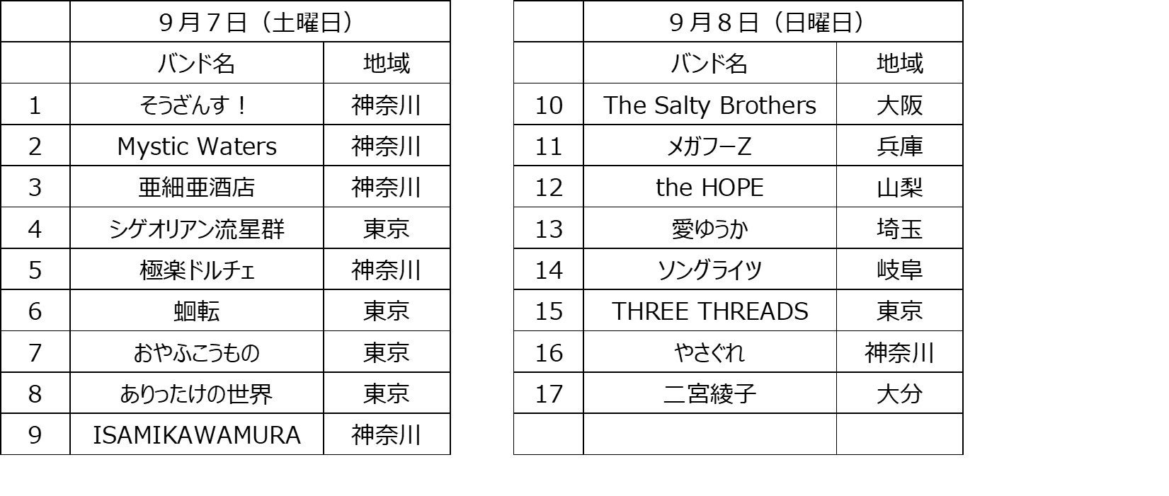 選考の結果、音楽ジャンルやメンバー構成、キャリアも多岐にわたるバンド・アーティストの中から、以下の17組のアーティストが一次審査を通過し、9月7日(土曜日)・8日(日曜日)に市内ライブハウスで開催する最終ライブ審査へ進出いたします。