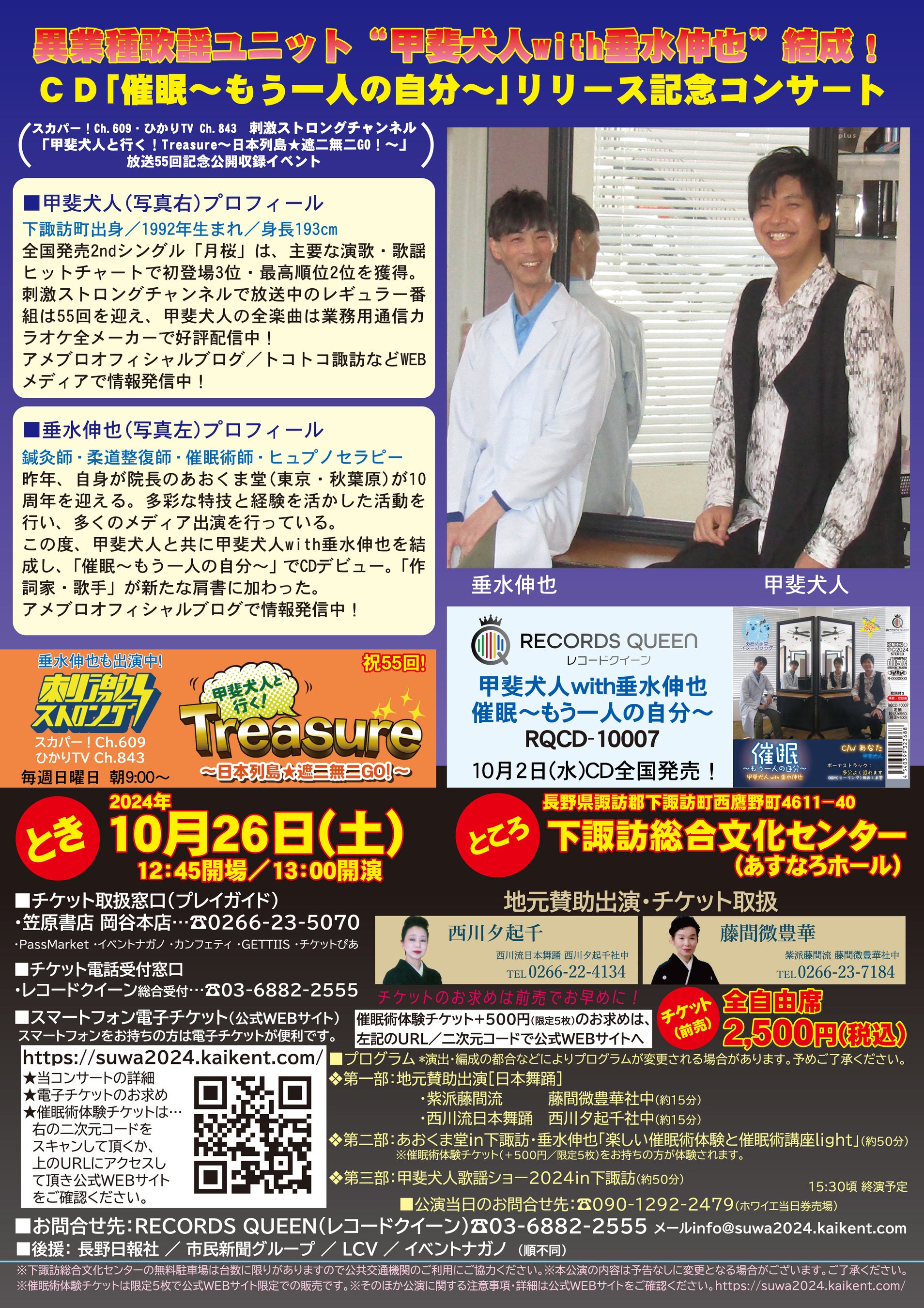 “甲斐犬人with垂水伸也”ファーストシングルCD「催眠~もう一人の自分~」(RQCD-10007/税込550円)全国CDリリースを記念して、甲斐犬人の出身地である長野県諏訪郡下諏訪町:下諏訪総合文化センター(あすなろホール)に於いて、異業種歌謡ユニット“甲斐犬人with垂水伸也”結成!CD「催眠~もう一人の自分~」リリース記念コンサートを開催し、バラエティ系演歌・歌謡曲歌手の甲斐犬人と鍼灸師・柔整師・催眠術師の垂水伸也による異業種歌謡ユニットの息の合ったデュエット曲「催眠~もう一人の自分~」をステージで初披露させて頂きます。
