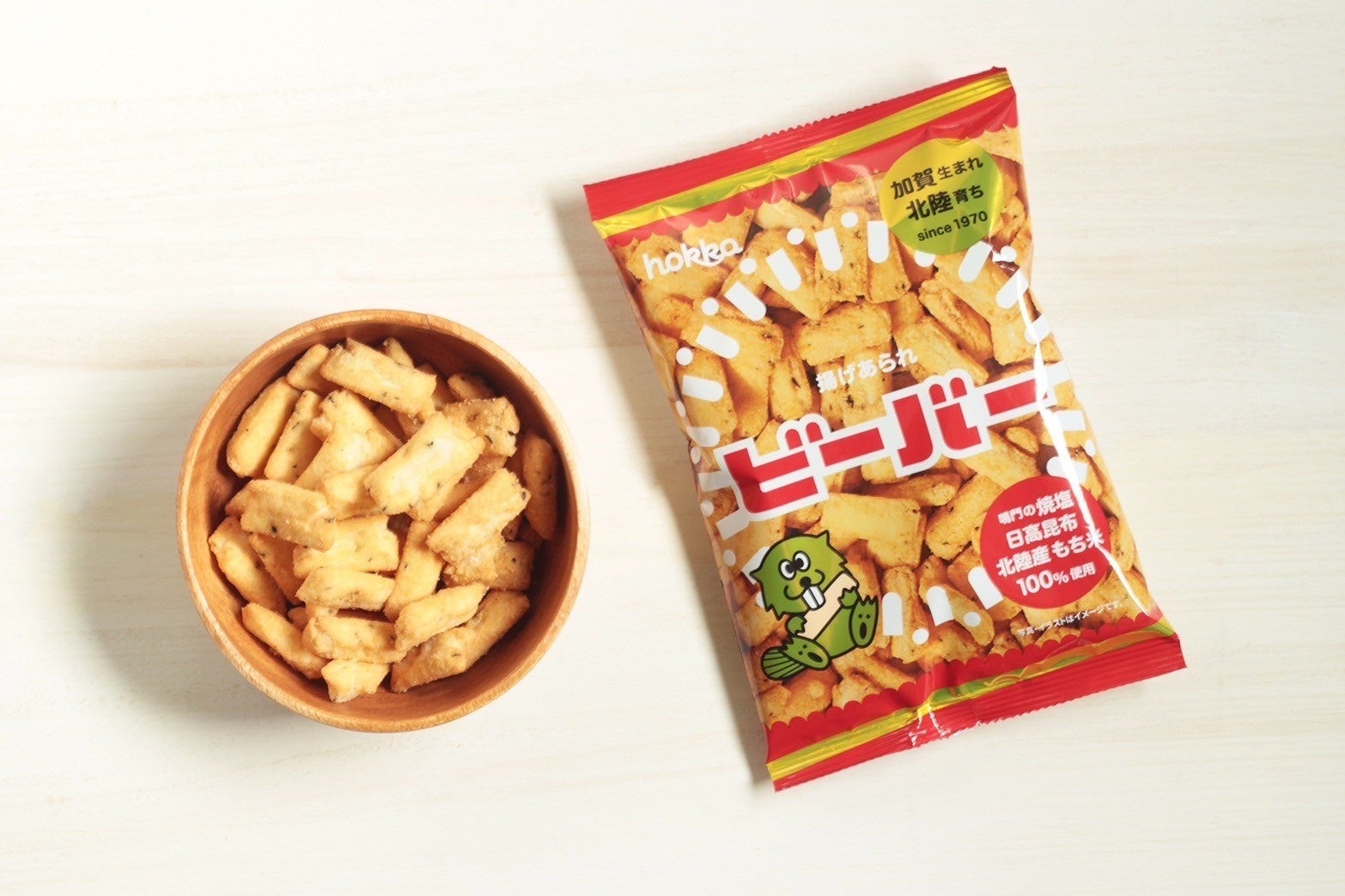 「ビーバー」は、1970年の発売以来、昭和・平成・令和の時代を通じて北陸で長く愛され続けているソウルフードです。「北陸産もち米」に「日高昆布」を練り込み、冷やし固めてから小さく切り、油で揚げて作られます。サクッと軽い食感が特徴のあられは、「徳島鳴門」の焼き塩が絶妙な塩加減で、昆布の旨みと相まって、一度食べたら止まらなくなるおいしさです。
