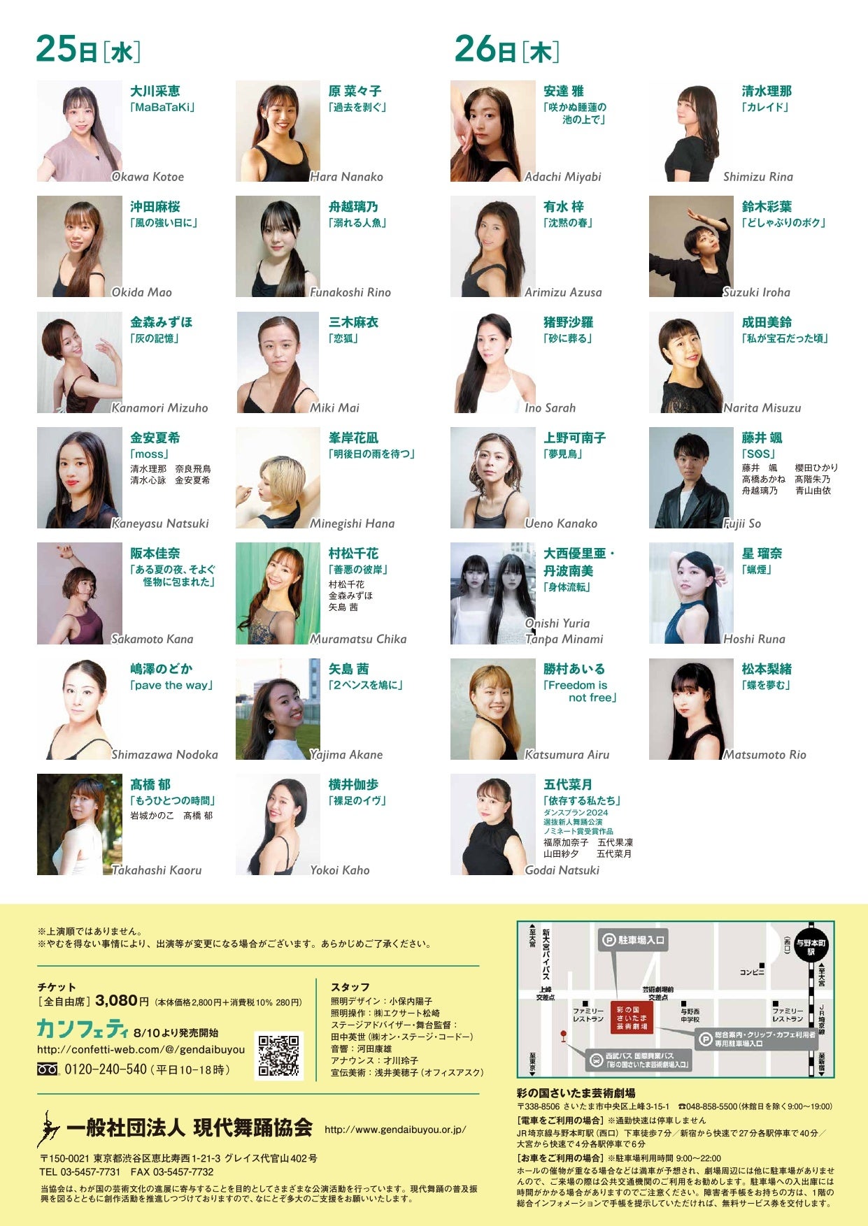 一般社団法人現代舞踊協会主催、令和6年度舞台芸術等総合支援事業(芸術家等人材育成)現代舞踊新進芸術家育成 project1『選抜新人舞踊公演』が2024年9月25日 (水) 〜 2024年9月26日 (木)に彩の国さいたま芸術劇場 小ホール(埼玉県 さいたま市中央区 上峰 3-15-1)にて上演されます。