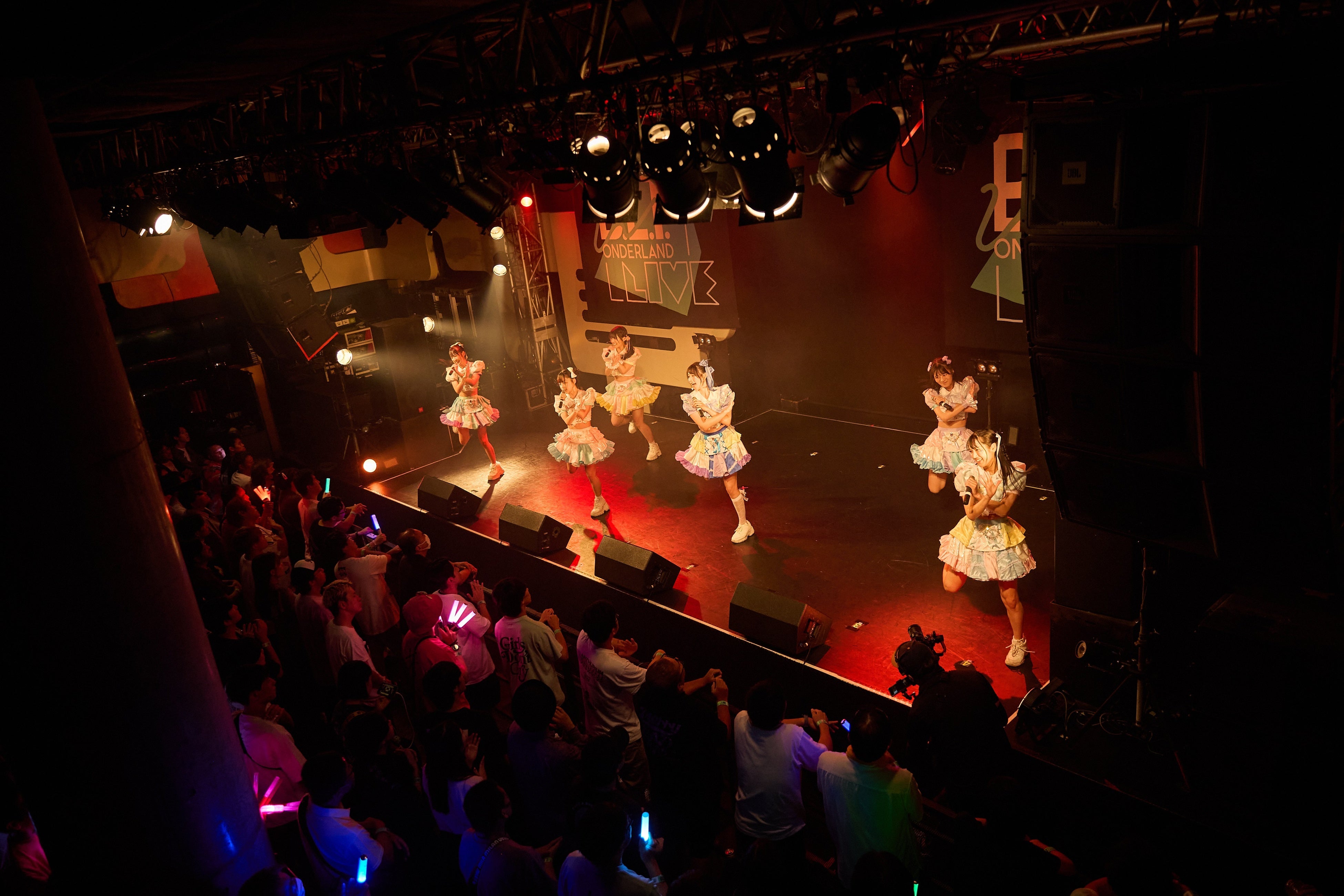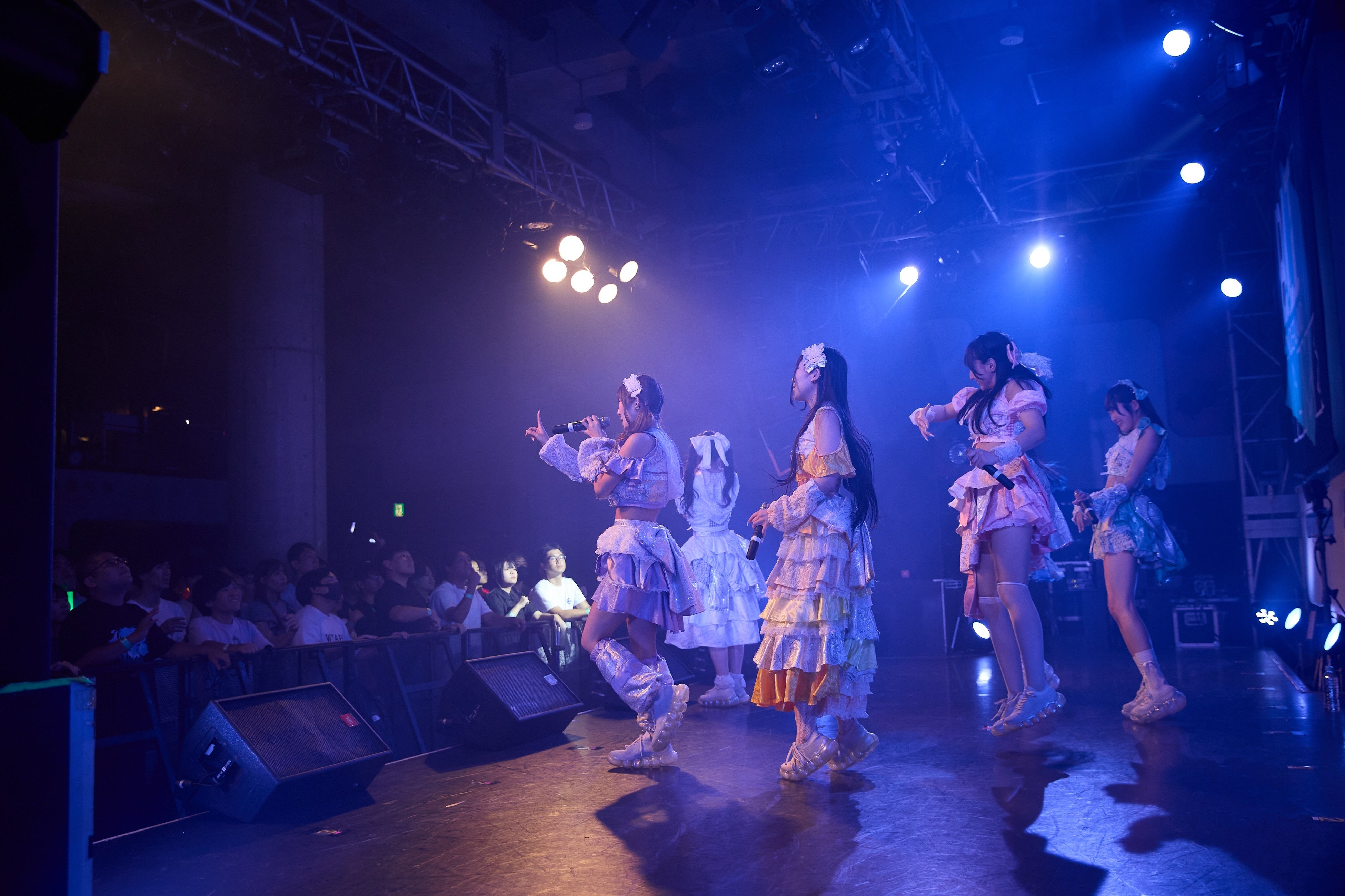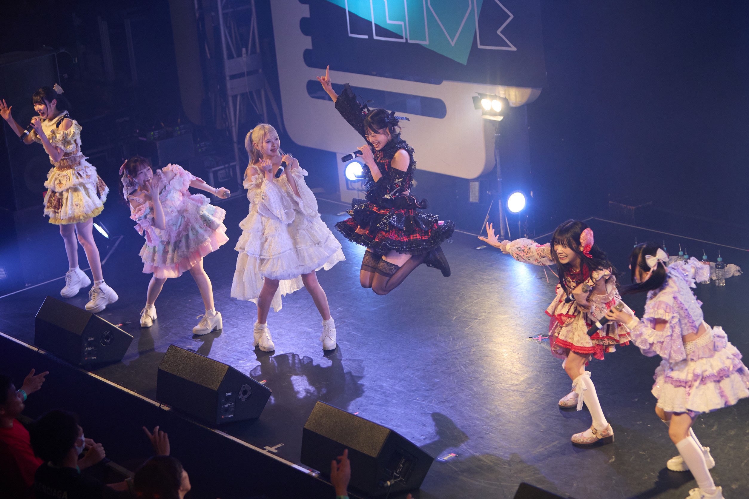 まず最初に登場したのは、元鉄工所勤務でグラビアアイドルとしても活躍し話題を呼ぶちとせよしのや、SNSで投稿された写真がバズった中川心ら多彩なメンバーが“つめあわされた” 今年2024年にデビューしたばかりのあまいものつめあわせ。新たなライブシリーズの幕開けを飾った楽曲は、彼女たちの代表曲「すぃ〜ちゅパラダイス」。元気なイメージの定番曲に続き、「おねだりゲーム」などの可愛い曲でフロアを魅了していく。トップバッターとして計6曲を披露し会場を熱狂へと誘った。