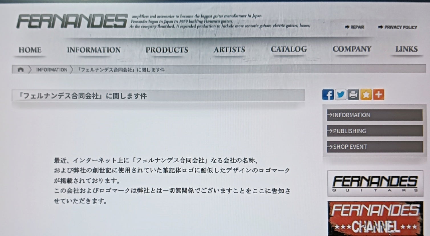 『最近、インターネット上に「フェルナンデス合同会社」なる会社の名称、および弊社の創世記に使用されていた筆記体ロゴに酷似したデザインのロゴマークが掲載されております。この会社およびロゴマークは弊社とは一切無関係でございますことをここに告知させていただきます。』