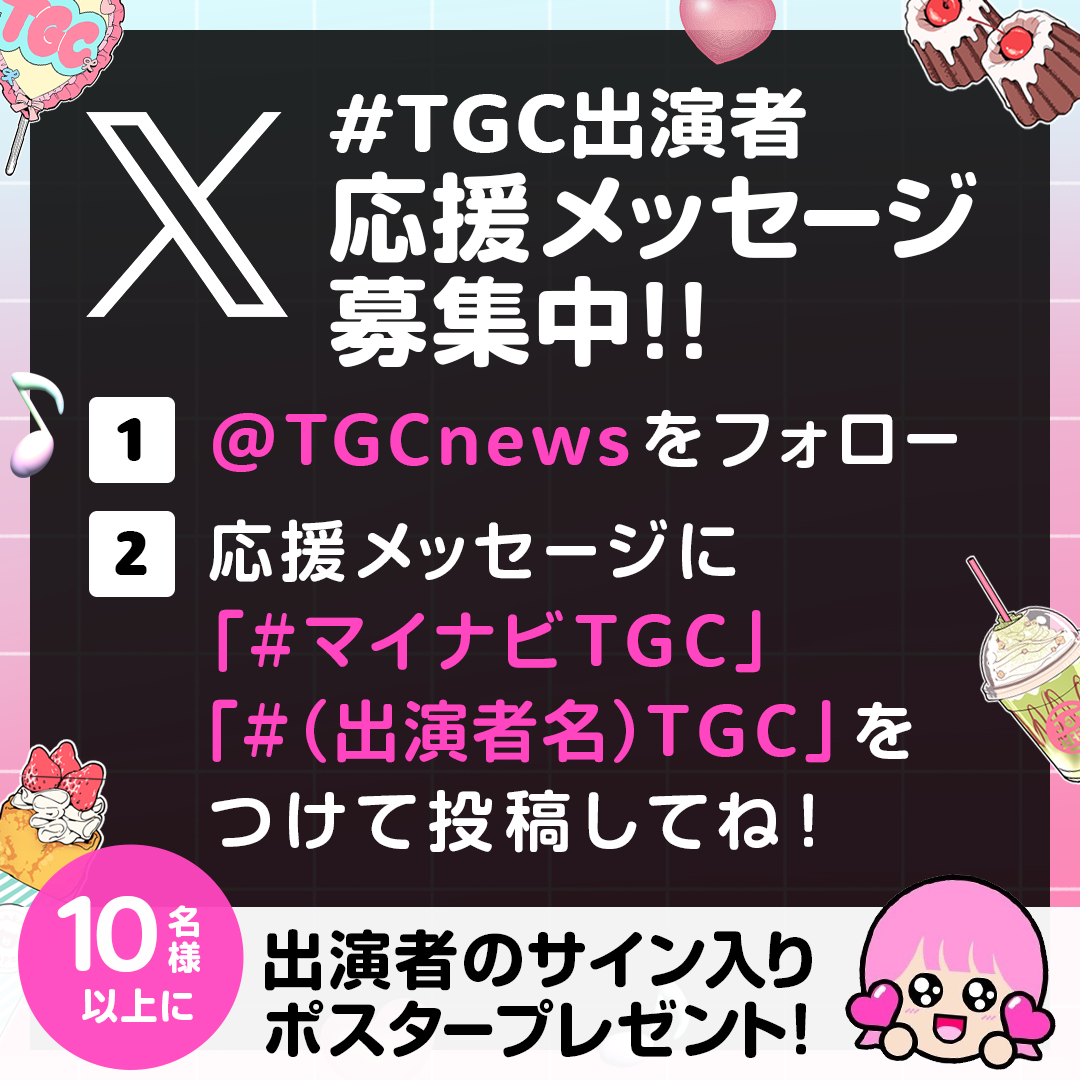 TGC公式X(@TGCnews)では、来場者はもちろん、配信を見ながら参加できる特別企画がスタート!公式SNSでは今後も続々とキャンペーンが登場しますので、お見逃しなく!
