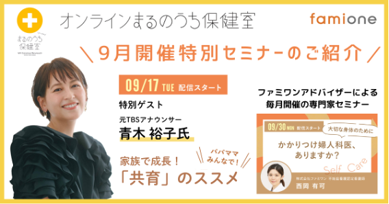 9月のオンラインセミナーには、元TBSアナウンサー 青木 裕子氏、株式会社ファミワン 不妊症看護認定看護師 西岡 有可が登壇します。青木氏のセミナーは、『家族で成長!「共育」のススメ』と題し、体験学習を通じて子どもと一緒に親も関わって成長していく方法が知れる、実体験に基づいたトークライブです。西岡のセミナーでは、婦人科医受診の目安や受診方法、かかりつけ医の見つけ方についてお話しいたします。