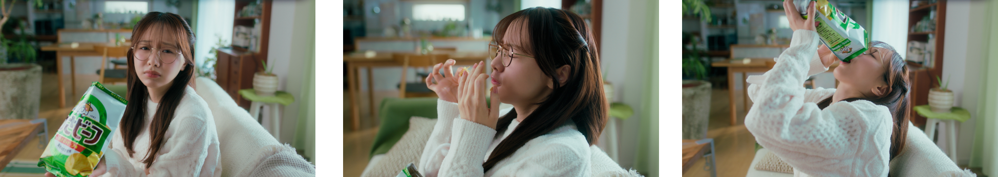 自宅でパートナーと一緒に、わさビーフを食べようとする森香澄さん。袋からわさビーフを一枚取り出し相手に「あ〜〜ん。」と食べさせようと思いきや…自分で食べてしまい「う〜〜ん、ツンッがたまらん…」と嘆くように、病みつきになってしまうとわさビーフのツンピリ感を感じてしまう森さんの表情に注目です。