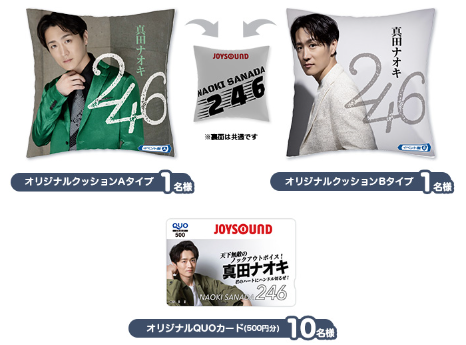 本キャンペーンに参加するには、最新機種「JOYSOUND X1」をはじめとした対象機種を導入のカラオケ店舗で、「うたスキ」(登録無料)に特設ページよりご応募ください。ご応募いただいた方の中から抽選で、真田ナオキ直筆サイン入り オリジナルクッションAタイプ、真田ナオキ直筆サイン入り オリジナルクッションBタイプを各1名様に、真田ナオキ直筆サイン入り オリジナルQUOカード(500円分)を10名様にプレゼントします。