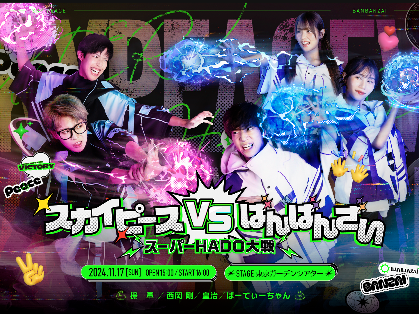 ARスポーツ「HADO」を運営する株式会社meleapは、2024年11月17日(日)に大人気YouTuberグループ「スカイピース」と「ばんばんざい」によるライブ&観客参加型ARスポーツイベント『スカイピース VS ばんばんざい スーパーHADO 大戦』を東京ガーデンシアターにて開催いたします。
