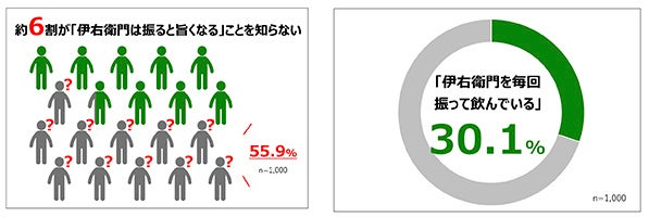 振るとさら旨くなることを知らない人は約6割(55.9%)と、まだまだ「伊右衛門は振るとさらに旨い」ことのイメージが定着していない状況が判明。また、全体のうち「毎回振って飲んでいる」と回答した人はわずか30.1%という結果に。意識的に「伊右衛門」を振って飲んでいる人は少数派となっている現状が明らかになりました。