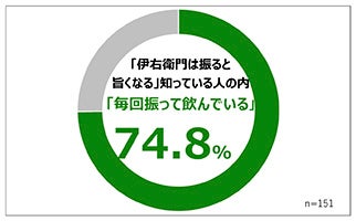 「伊右衛門」は振ると更に旨くなると元々知っていた15.1%のうち、74.8%もの人は“毎回振って飲んでいる”と、振って飲むことでその旨さを実感している状況が分かりました。