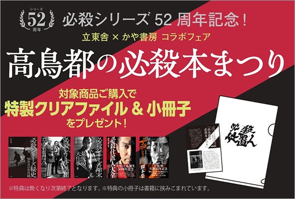 本フェアでは対象商品購入者の方へ「必殺仕置人」の番組ロゴと全話サブタイトルをあしらった特製クリアファイルと、高鳥氏が自著を紹介する解説小冊子をプレゼント。必殺ファンは見逃せないフェアとなっております!