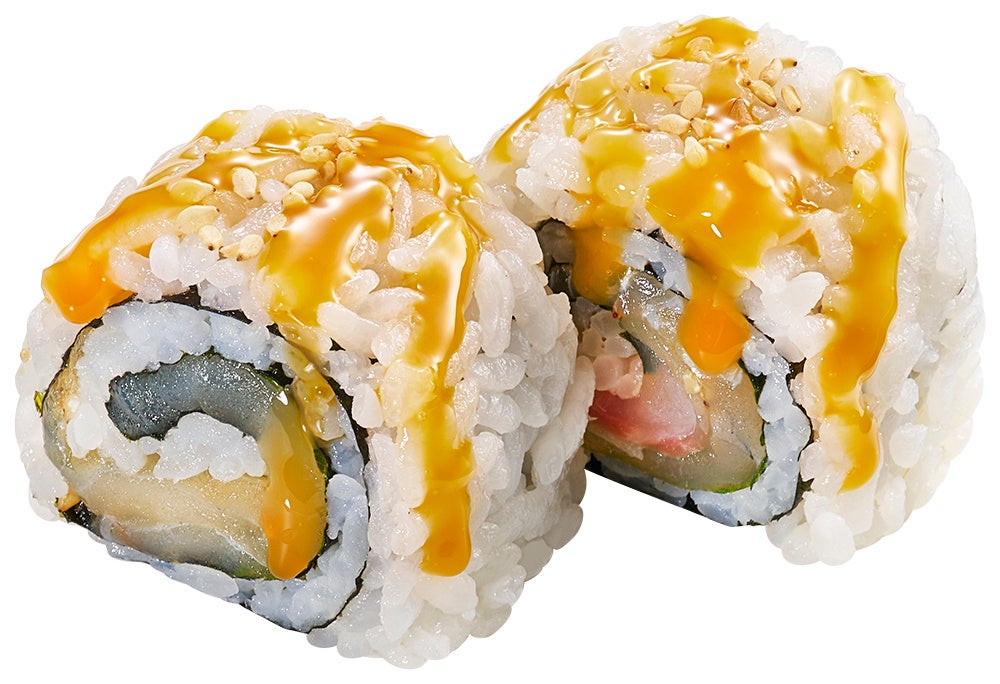 「どっちも食べ鯛!W鯛めし風にぎり」は、愛媛の郷土料理「鯛めし」をイメージした創作すしで、鯛めし風にぎり2種を食べ比べしていただけます。1つは、特製ダレで漬けた漬け胡麻真鯛を店内で炙り、松山の鯛めしをイメージしたおすしです。トッピングの胡麻もアクセントになり、香ばしい真鯛と胡麻の風味が感じられます。もう1つは、漬けにした真鯛に海苔を巻き、卵黄醤油をかけた宇和島の鯛めしをイメージしたおすしです。うまみが凝縮した漬け真鯛、コクのある卵黄醤油、香ばしい海苔の相性は抜群です。また、愛媛銘菓のタルトをイメージしたロールすしも登場します。「鯛のタルト風巻き」は、漬け胡麻真鯛と大葉をしゃりで巻き、仕上げに卵黄醤油をかけました。漬けにした鯛のうまみと胡麻の風味、大葉の爽やかな香りを、コクのある卵黄醤油がうまくまとめ上げています。