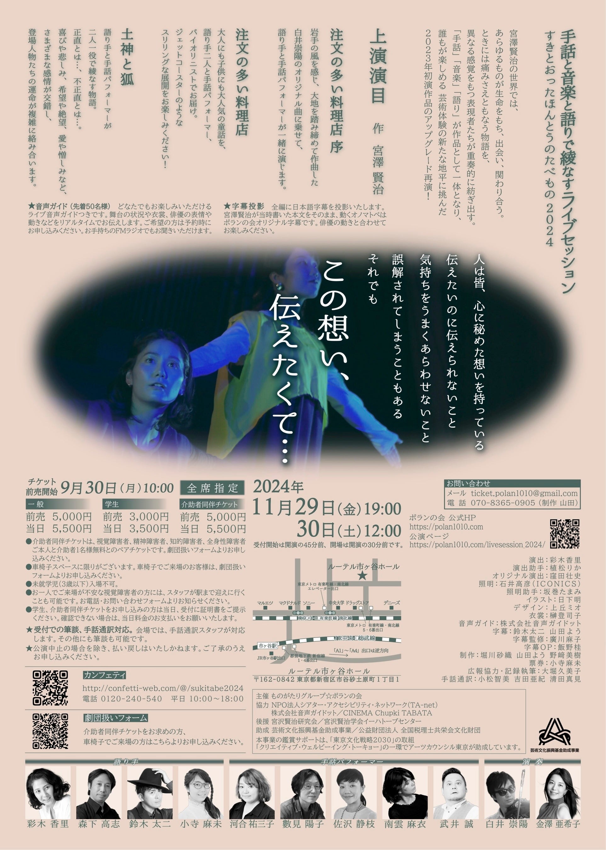 2023年、宮澤賢治の人気三作品を「手話」「音楽」「語り」のコラボレーションで上演し、好評を博した演劇公演『手話と音楽と語りで綾なすライブセッション すきとおったほんとうのたべもの』が2024年11月にアップグレードして帰ってくる!