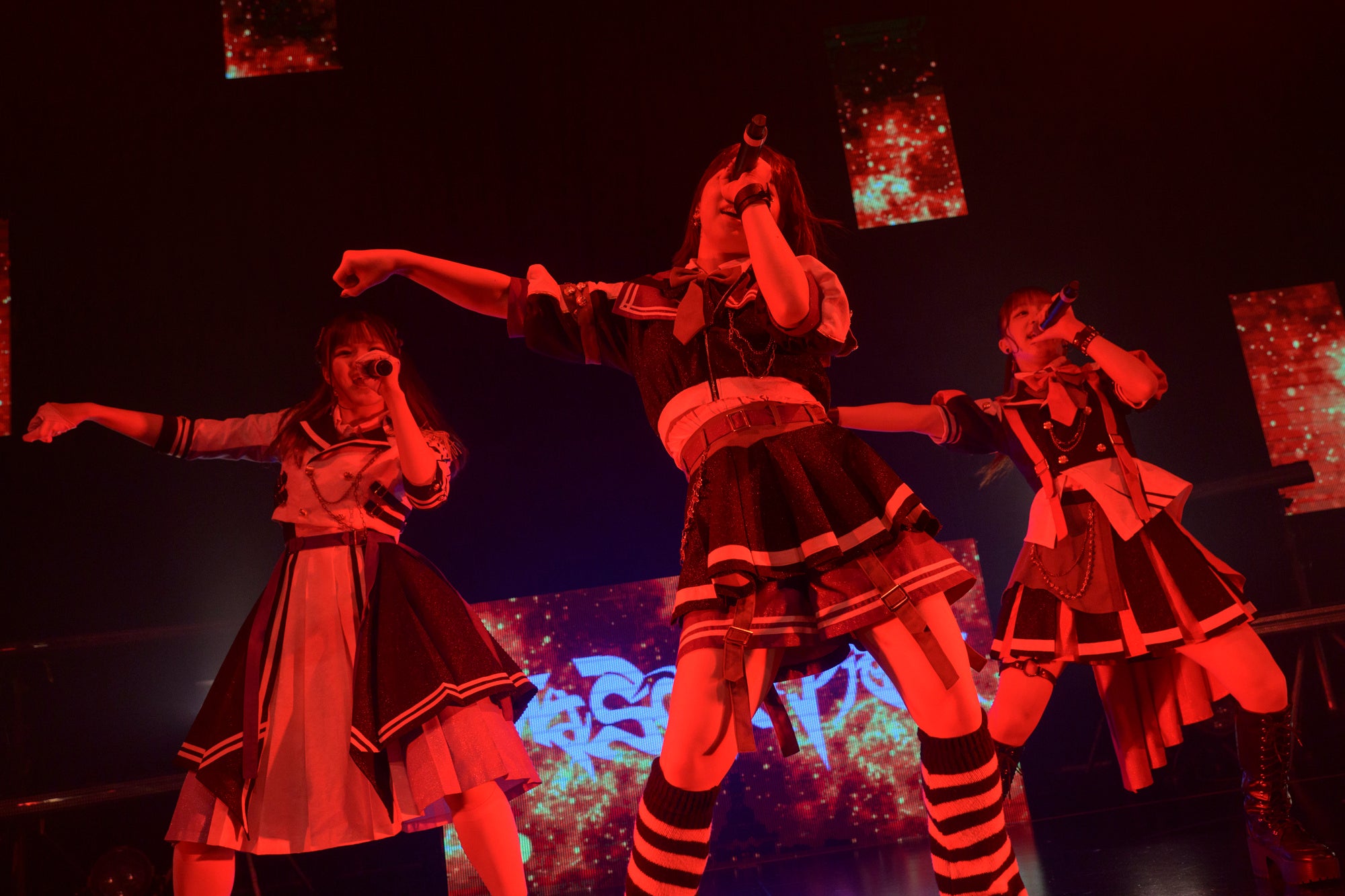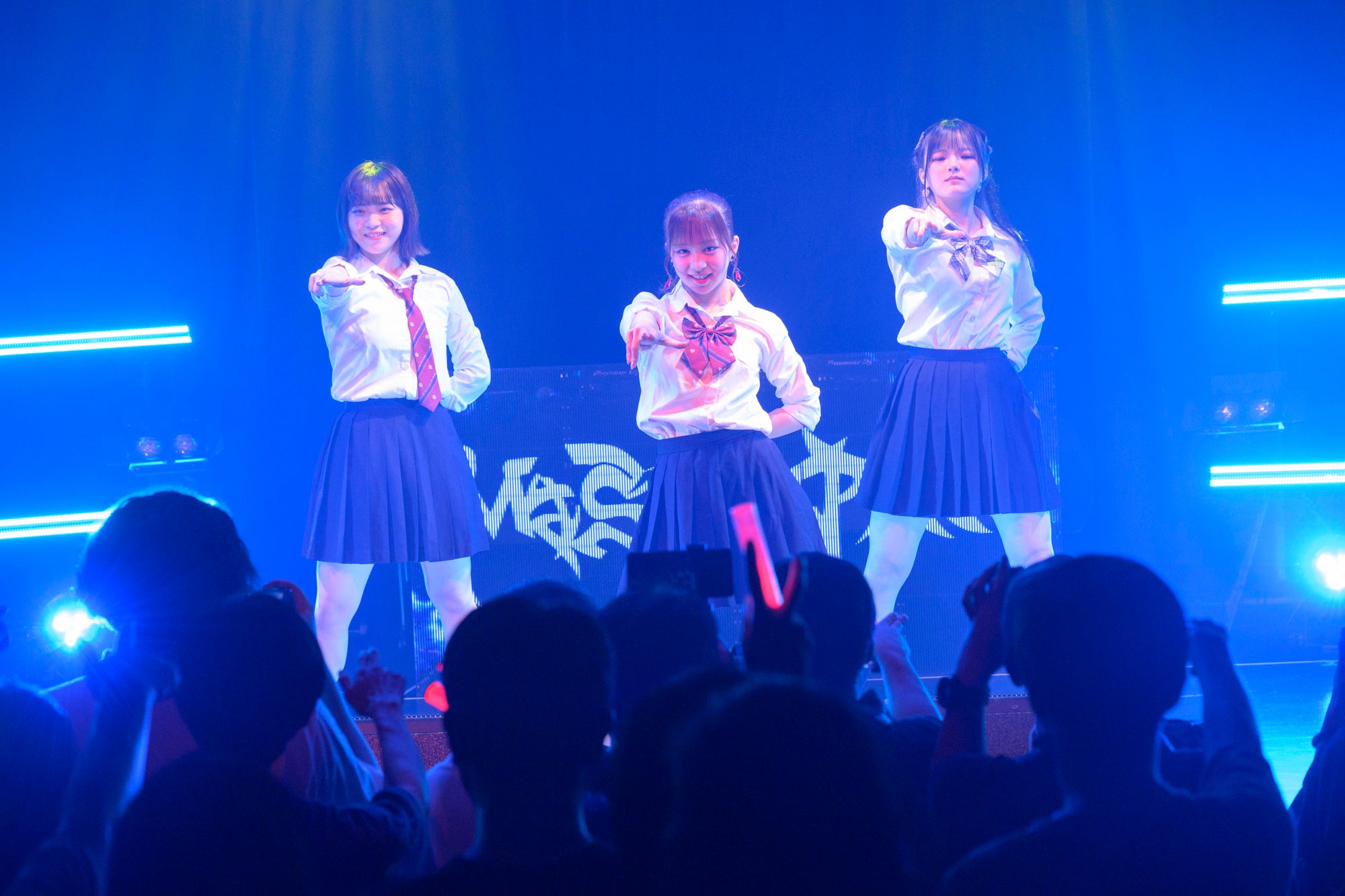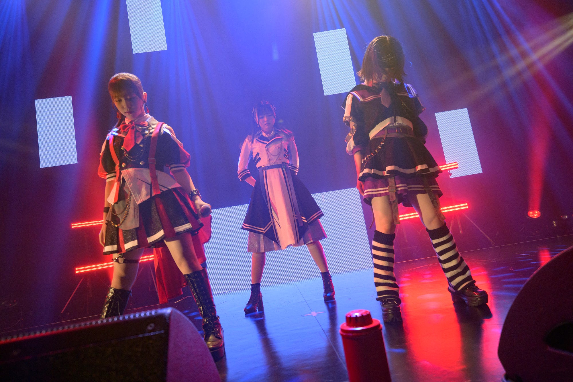 オールスタンディングのSpotify O-WESTのホールにOvertureが流れると、フラッグ・ハンドメガホン・ヘッドセットと小道具を掲げて、北沢音箱高校のキャラクターの衣装を着た3人が登場。初めてのオリジナル曲「Rock it, and fight!!」が、電音部らしい重低音のクラブサウンドに乗せてライブの始まりを告げる。息の合ったダンスとラップで場内のボルテージを一気に上げていく。続いて歌う「爆烈タウマゼイン」は電音部のシブヤエリア・帝音国際学院からのカバー。疾走感ある和ロックのサウンドにのせて、パワフルそしてコミカルに電音部の世界観を歌い上げていく。さらにオリジナル曲「圧倒的アイドルの極み」でもアッパーサウンドとダンスで一層熱気は高まっていく。