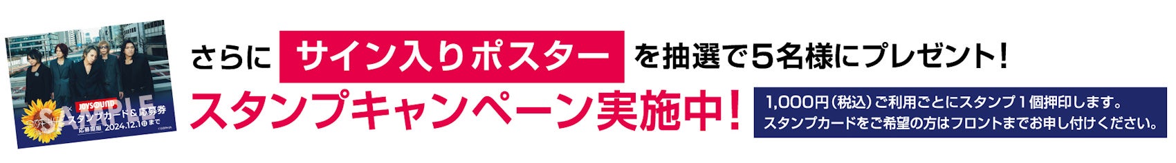 コラボドリンクご注文でお渡しするスタンプカードに、カラオケご利用金額 1,000 円(税込)ごとにもらえるスタンプを5つ集めて応募すると、メンバーのサイン入りポスターが抽選で5名様に当たる、スタンプキャンペーンも実施します!