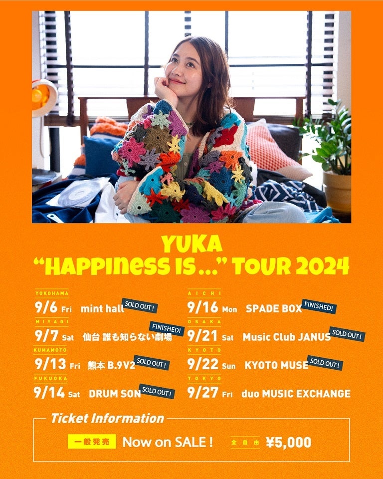9月27日(金)に東京で開催される「YUKA “Happiness is … ” TOUR 2024」のツアーファイナルも一般発売中なので最後の機会を見逃さないよう奮って応募しよう。