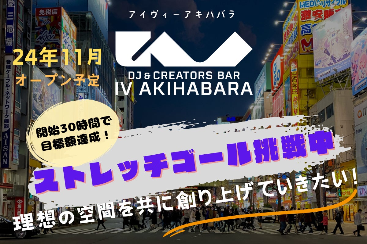株式会社4×4(フォー・バイ・フォー 代表取締役:川池 翔)は、秋葉原エリアにおける音楽・クラブカルチャーの更なる発展を目指しスタートした「DJ/CREATORS BAR “IV AKIHABARA”(アイヴィー・アキハバラ)」のオープンに関するプロジェクトのクラウドファンディングが、目標額の250%を突破した事を発表致します。