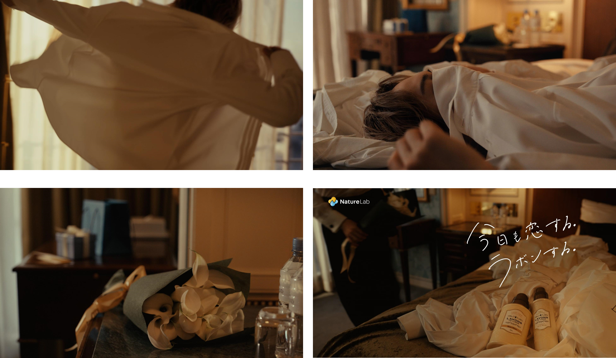 夕方のホテルの一室。ラボンの香りをまとった最高のシャツで、彼女との特別なデートの身支度をしている玉森さん。ところがそのシャツがなかなか決まらず、着ては、脱いで、着ては、脱いで…とっかえひっかえ試しています。だんだんとシャツの山が大きくなり、ちょっと疲れてベッドに横たわったり、窓際に座り外の夕陽を眺めたり…。ようやく「いちばんのシャツ」が決まり、鏡の前で納得の表情。プレゼントと花束とジャケットを持ち、彼女の待つ場所へ向かうのでした。