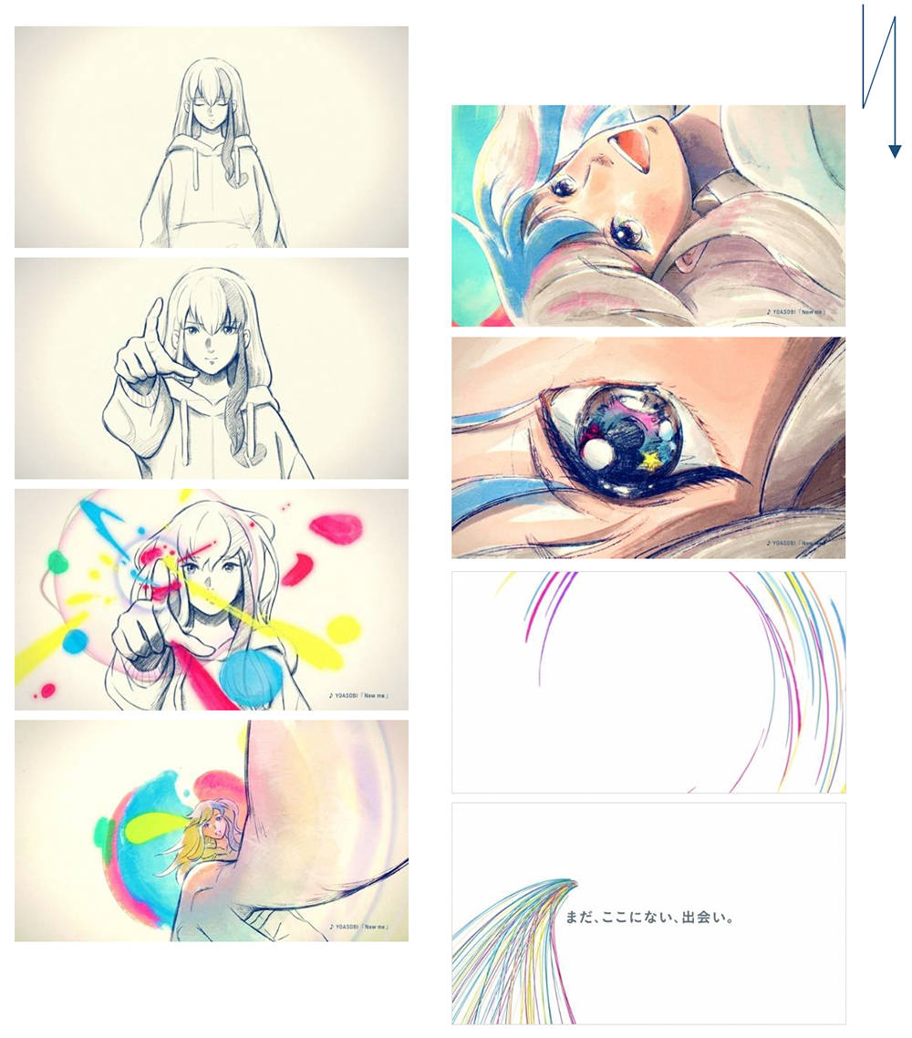 本TVCMには、2024年10月1日で結成から5周年の節目を迎えたYOASOBIが「モノコン 2023」で大賞を受賞した作品『白山通り炎上の件』を原作に書き下ろした新曲、「New me」を使用しています。CMのストーリーは、誰しも抱える悩みや迷い、モヤモヤを表現するため、あえてモノクロで不完全なアニメーションで始まります。主人公の「わからないまま、それでも踏み出した一歩は、忘れない。」という前向きなメッセージをきっかけに世界が鮮やかに彩られていき、リクルートのブランドメッセージ「まだ、ここにない、出会い。」のロゴに描かれる虹につながっていきます。YOASOBIの楽曲と相まって、新たな旅の幕開けに期待を感じていただけるCMとなっています。