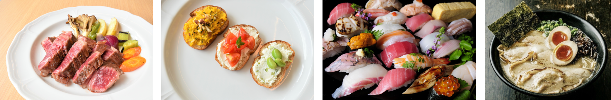 生後8~10ヶ月から約20ヶ月間、一頭一頭大切に育てられた黒毛和牛の中から厳しい品質検査により選び抜かれた牛だけにその名が与えられる「小倉牛」の炭火焼ステーキ、北九州市の若松で育った枝豆、トマト、かぼちゃなどのこだわり野菜が彩る自家製パンのブルスケッタ、響灘、玄界灘、周防灘、そして関門海峡に囲まれた、優れた漁場で水揚げされる新鮮な魚を「廻転寿司 平四郎」が握る、“すしの都 北九州”ならではの3貫盛、豚骨を約15時間炊き込み、濃度を極限まで高めた「石田一龍」の濃厚ラーメンなど、豪華ラインアップで思い出に残る料理を心をこめて提供します。