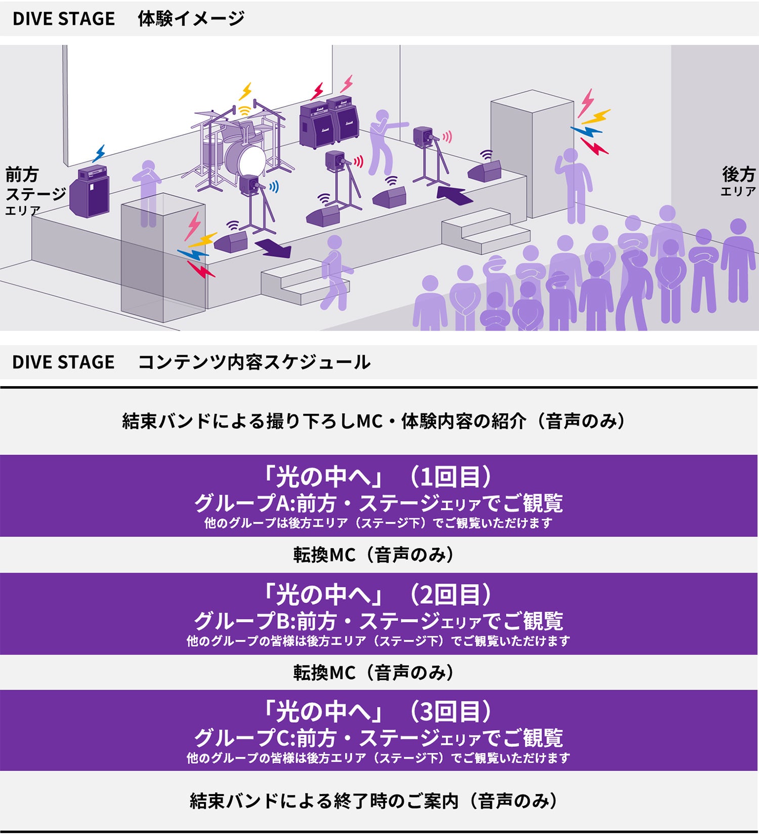 『DIVE STAGE』 では、ライブハウスをイメージした音響とステージ環境で、「結束バンド」の再現演奏を視聴するだけでなく、ステージの上も回遊することができ、ステージ上でバンドメンバーたちが体感するサウンドを「生音」で疑似体験いただけます。